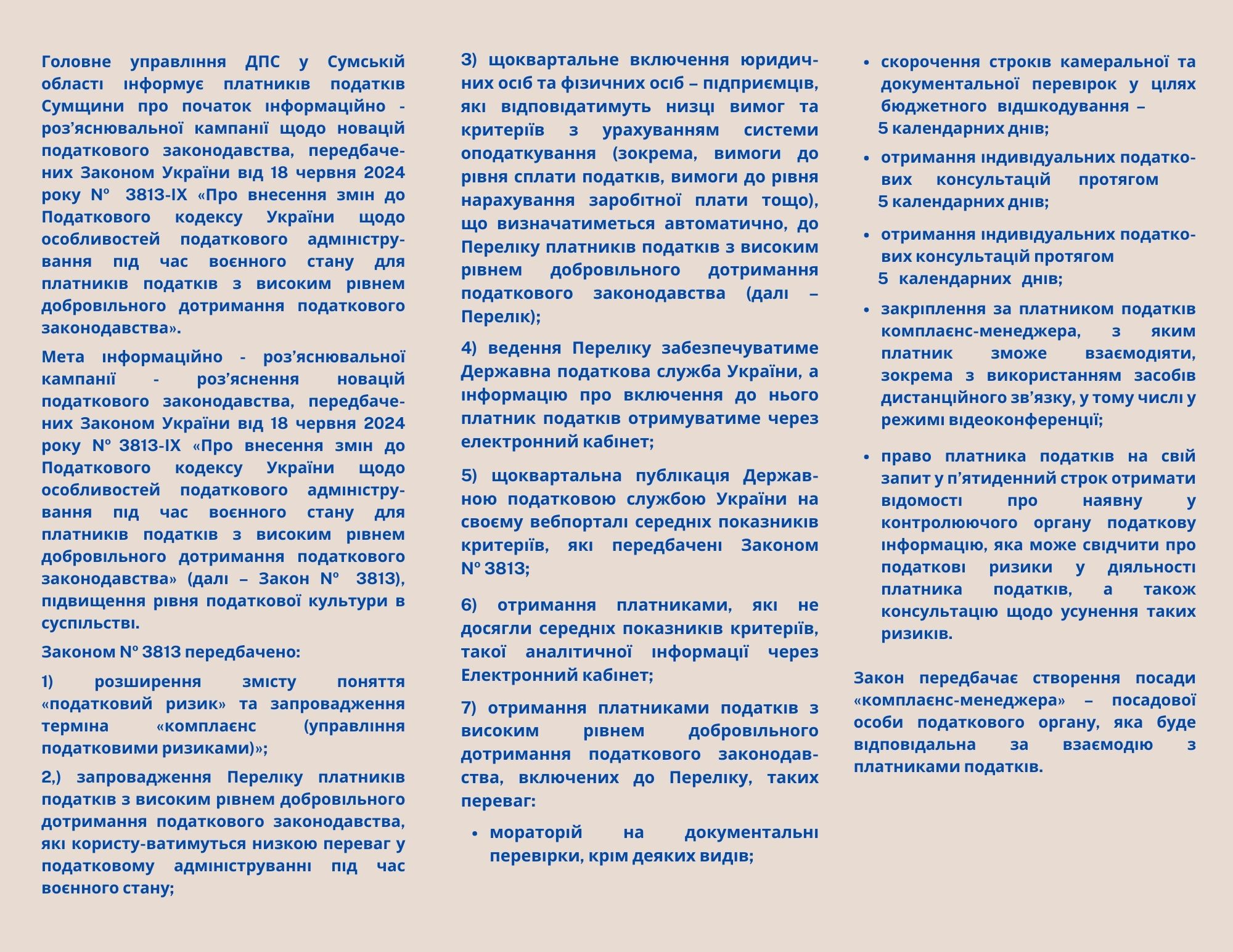 - Стартувала інформаційна кампанія щодо податкових новацій для платників податків з високим рівнем добровільного дотримання податкового законодавства