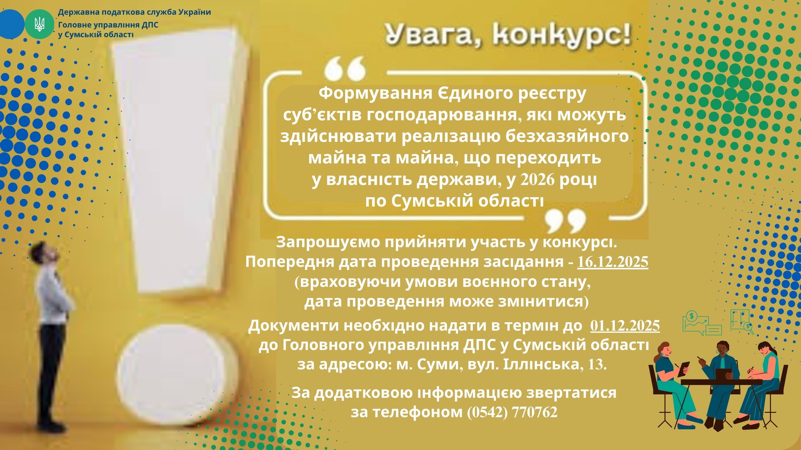 - Увага! Оголошується конкурс з формування Єдиного реєстру суб’єктів господарювання, які можуть здійснювати реалізацію безхазяйного майна та майна, що переходить у власність держави