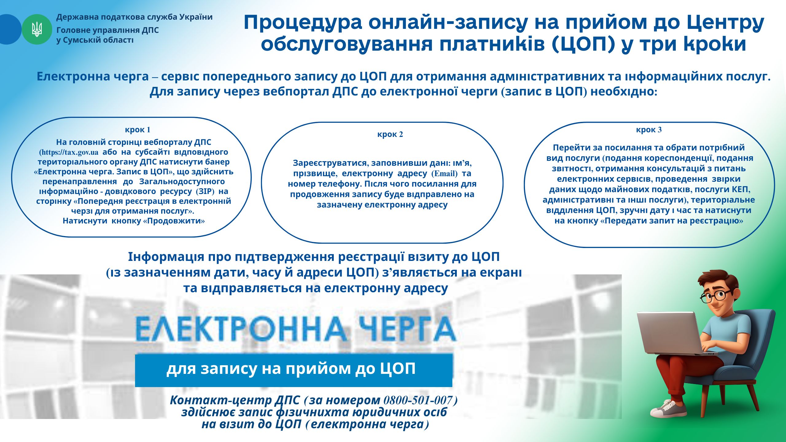 Процедура онлайн-запису на прийом Центру обслуговування платників (ЦОП) у три кроки