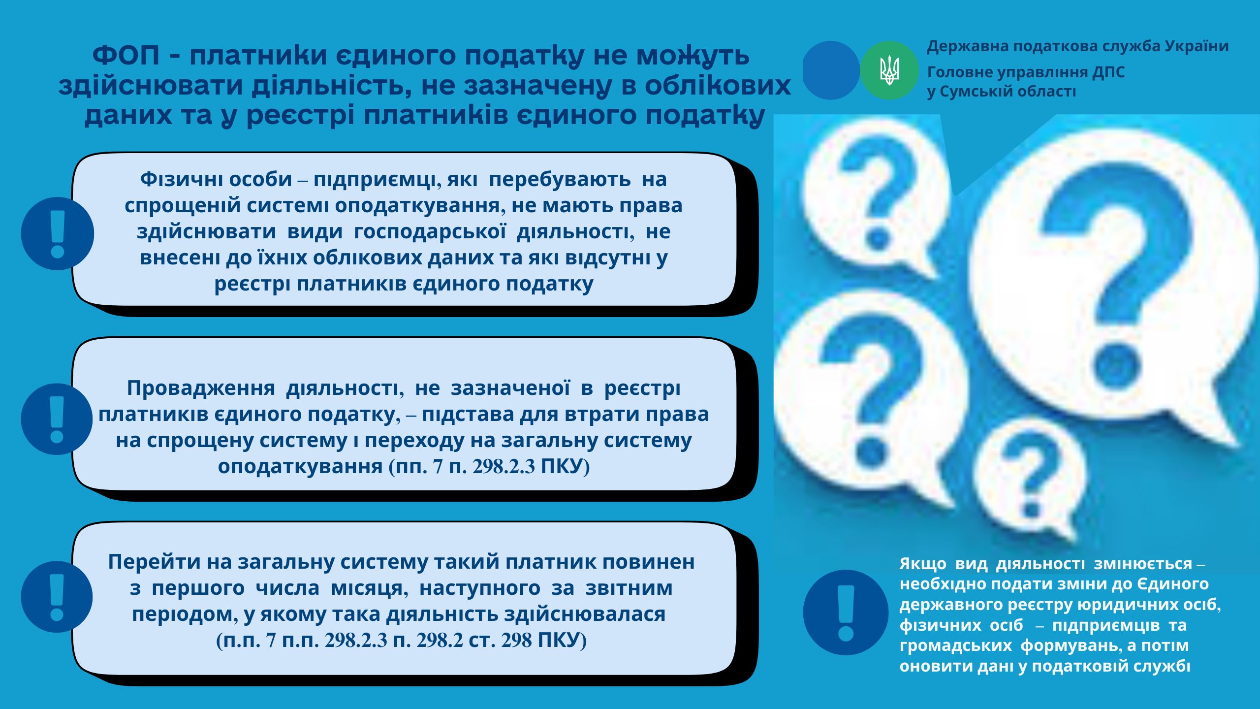 ФОП - платники єдиного податку не можуть здійснювати діяльність, не зазначену в облікових даних та у реєстрі платників єдиного податку