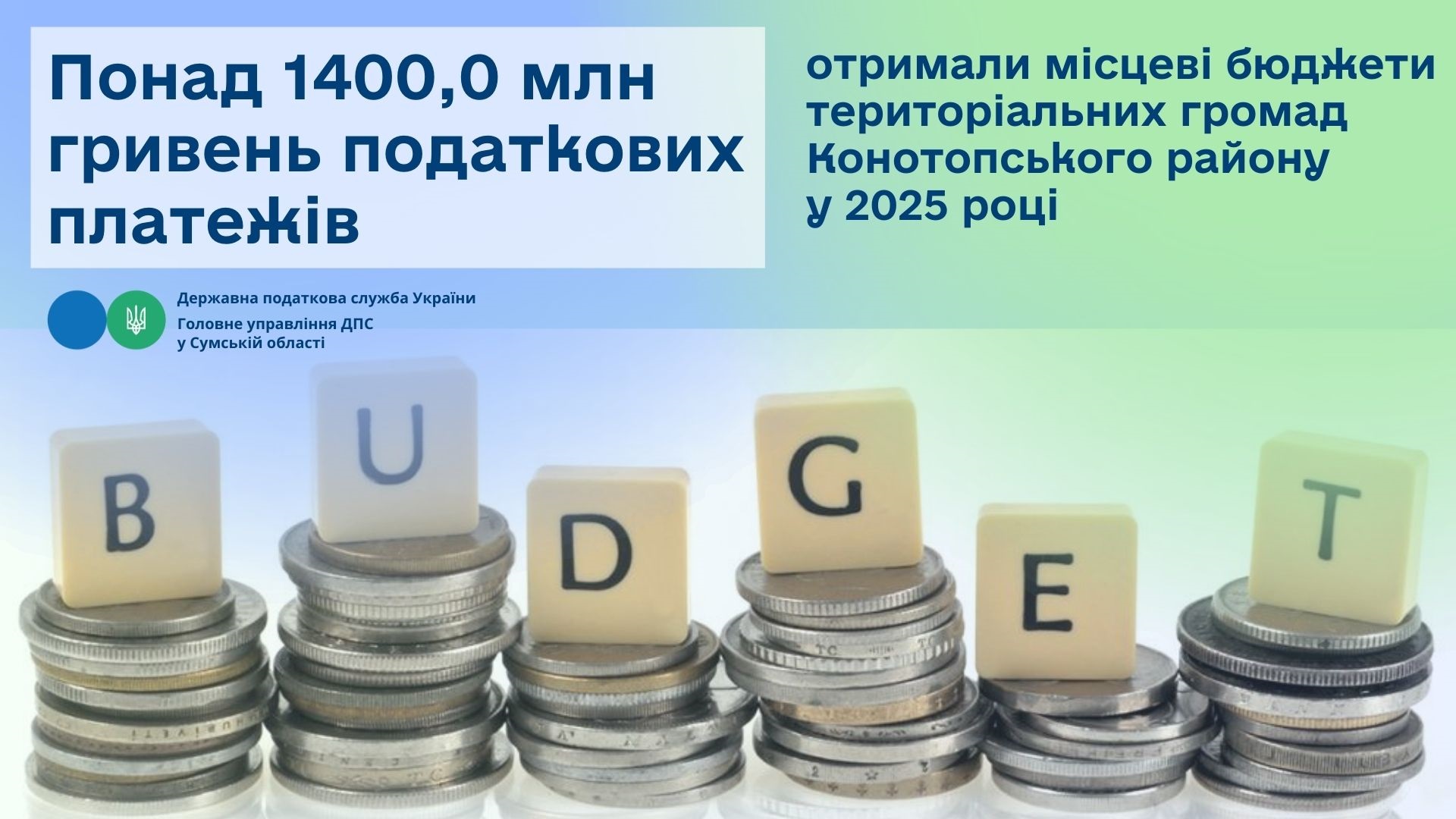 За інформацією управління економічного аналізу Головного управління ДПС у Сумській області до бюджетів територіальних громад Конотопського району (без обласного бюджету) у січні – грудні 2025 року надійшло податкових платежів в сумі 1407,9 млн грн податкових платежів. Зазначена сума на 178,3 млн гривень (або на 14,5 відс.) перевищила показник аналогічного періоду минулого року.
