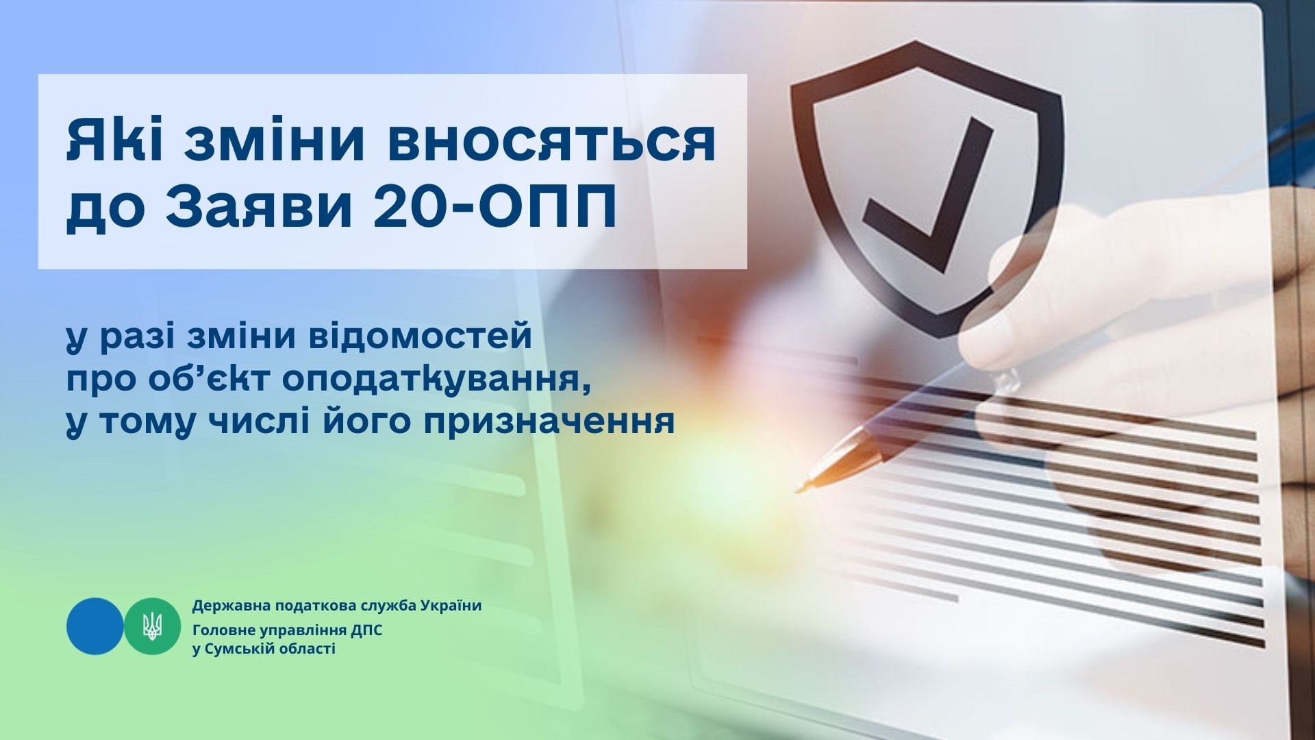 У разі зміни відомостей про об’єкт оподаткування, а саме: зміна типу, найменування, місцезнаходження, виду права або стану об’єкта оподаткування, платник податків надає до контролюючого органу за основним місцем обліку Заяву за ф. № 20-ОПП з оновленою інформацією про об’єкт оподаткування, щодо якого відбулися зміни, в такому самому порядку та строки, як і при реєстрації, створенні чи відкритті об’єкта оподаткування та у графу 2 «Код ознаки надання інформації» вноситься значення «3 – зміна відомостей про об’єкт оподаткування».
