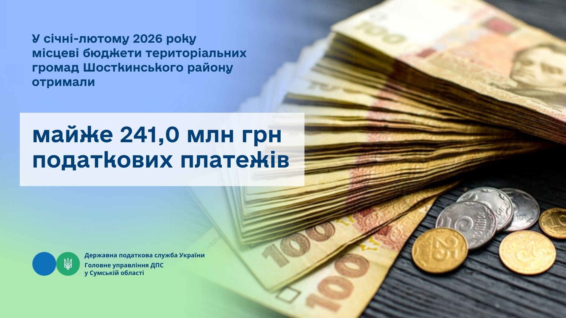 За інформацією управління економічного аналізу Головного управління ДПС у Сумській області до бюджетів територіальних громад Шосткинського району (без обласного бюджету) з початку 2026 року надійшло 240,8 млн гривень. Зазначена сума на 15,3 млн грн (або на 6,8 відс.) перевищила показник аналогічного періоду минулого року.