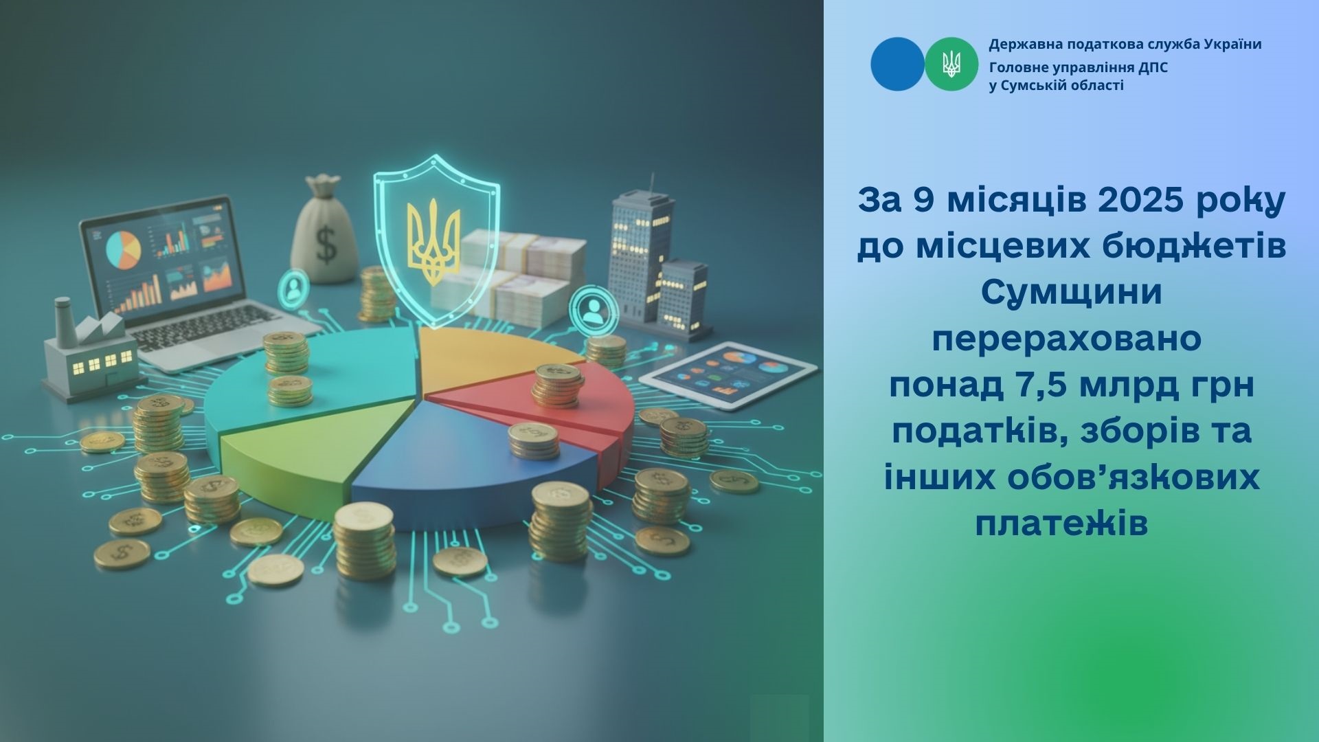 За 9 місяців 2025 року до місцевих бюджетів Сумщини перераховано понад 7,5 млрд грн податків, зборів та інших обов’язкових платежів