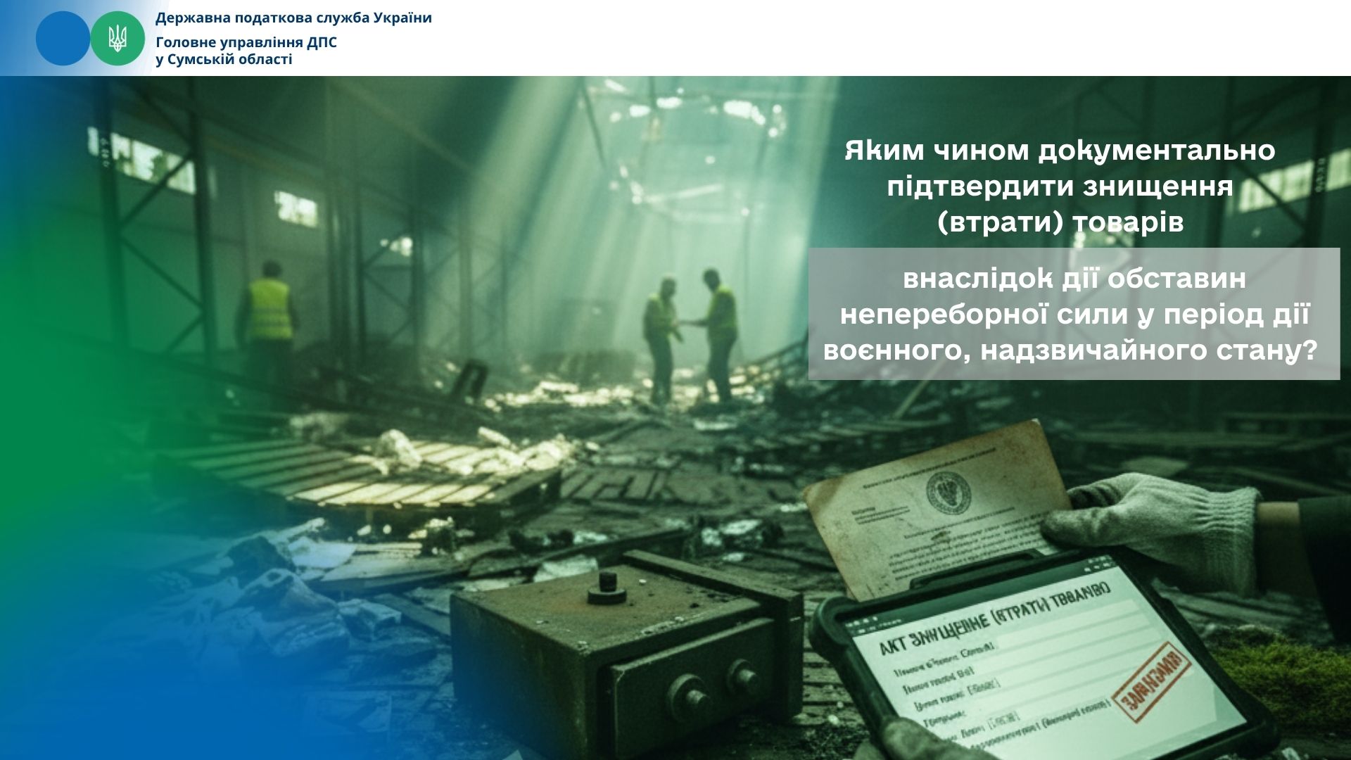 Отже, підтвердження знищення (втрати) товарів платника внаслідок настання дії обставин непереборної сили у період дії воєнного, надзвичайного стану повинно здійснюватися на підставі відповідних первинних документів та за наявності сертифіката про форс-мажорні обставини (обставини непереборної сили).