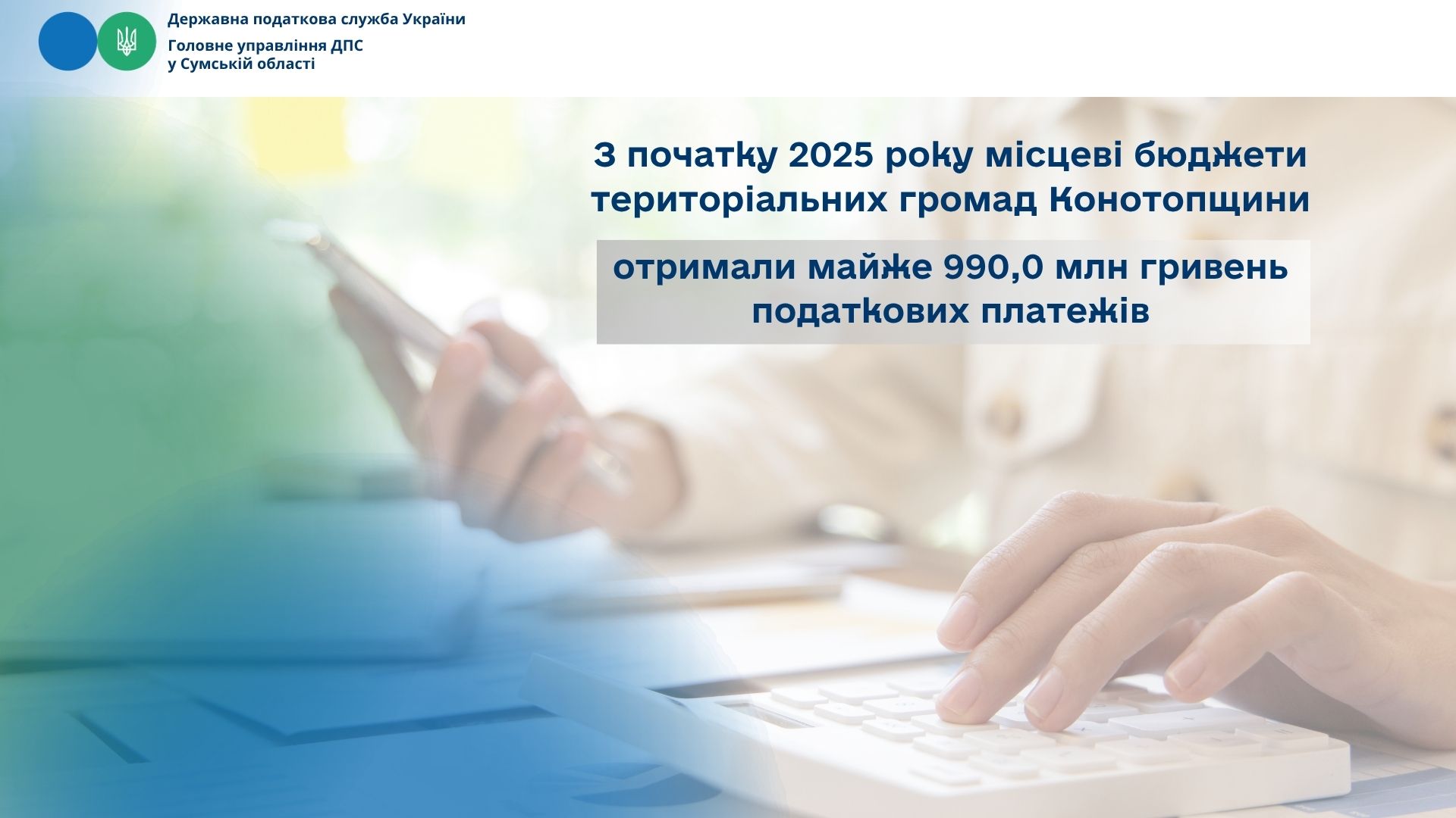 За інформацією управління економічного аналізу Головного управління ДПС у Сумській області до бюджетів територіальних громад Конотопського району (без врахування обласного бюджету) у січні – вересні 2025 року надійшло податкових платежів в сумі 987,4 млн гривень. Зазначена сума на 125,9 млн гривень (або на 14,6 відс.) перевищила показник аналогічного періоду минулого року.