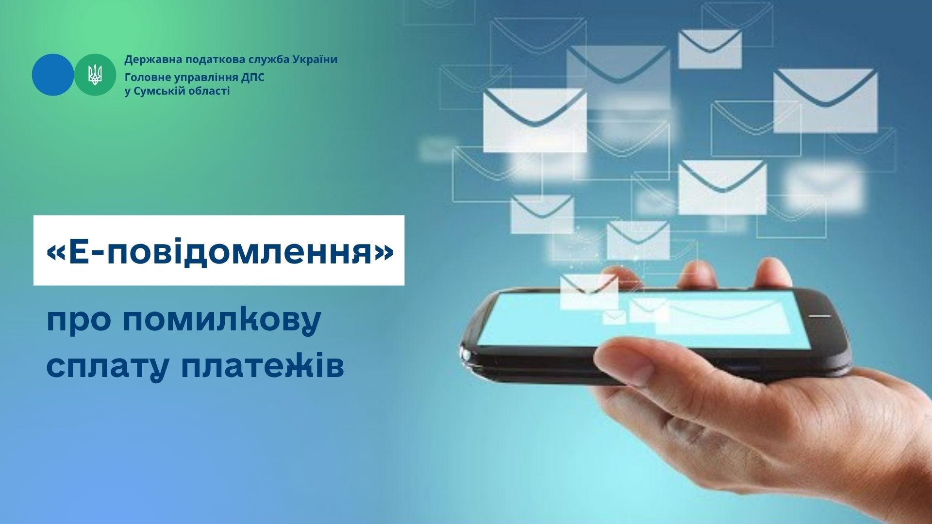 Головне управління ДПС у Сумській області   нагадує, що Державною податковою службою України з метою підвищення рівня інформування платників податків про суми помилково сплачених податкових платежів, єдиного внеску розроблено та впроваджено новий сервіс «Е-повідомлення». Відтак, платники податків, користувачі електронного кабінету, мають можливість отримувати в розділі Вхідні/вихідні документи/ Вхідні/ Повідомлення/ електронне інформаційне повідомлення про помилкову сплату платежів та миттєво здійснювати направлення до територіального органу ДПС, в якому обліковуються такі суми, заяву про перерахування коштів в електронному форматі.