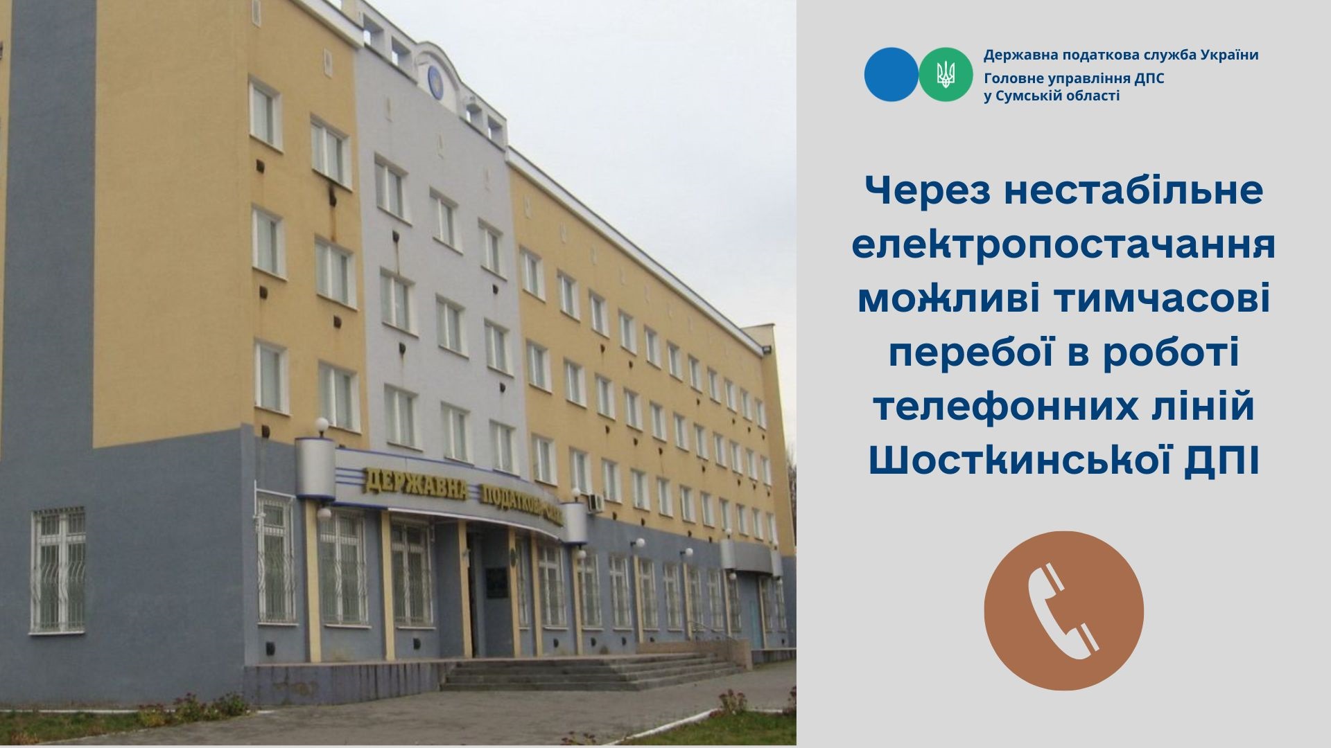 Головне управління ДПС у Сумській області повідомляє, що у зв’язку з нестабільним електропостачанням можливі тимчасові перебої в роботі телефонних ліній Шосткинської ДПІ.