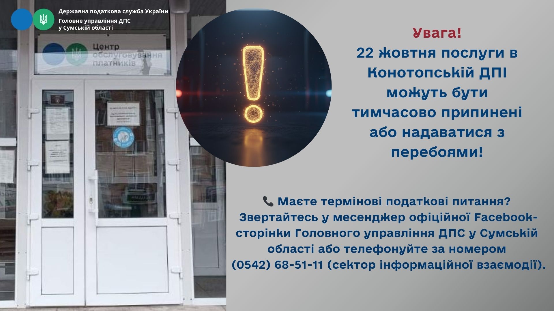 Головне управління ДПС у Сумській області повідомляє: у зв’язку з масованою ворожою атакою на місто Конотоп та з огляду на безпекову ситуацію в цілому, сьогодні, 22 жовтня, надання адміністративних послуг в Конотопській ДПІ може бути тимчасово припинено або послуги можуть надаватися з перебоями. У тому числі можливі перебої в роботі телефонних ліній.