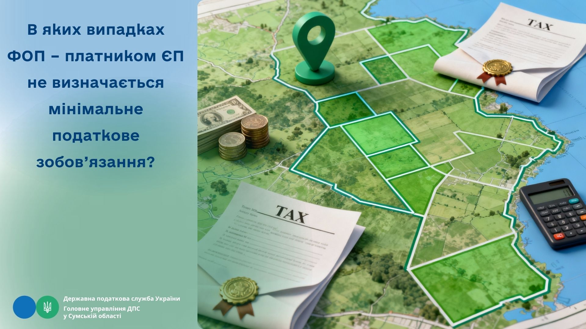 Головне управління ДПС у Сумській області повідомляє, що відповідно до п.п. 14.1.114 прим. 2 п. 14.1 ст. 14 Податкового кодексу України від 02 грудня 2010 року № 2755-VІ (далі – ПКУ) мінімальне податкове зобов’язання – мінімальна величина податкового зобов’язання із сплати податків, зборів, платежів, контроль за справлянням яких покладено на контролюючі органи, пов’язаних з виробництвом та реалізацією власної сільськогосподарської продукції та/або з власністю та/або користуванням (орендою, суборендою, емфітевзисом, постійним користуванням) земельними ділянками, віднесеними до сільськогосподарських угідь, розрахована відповідно до ПКУ. Сума мінімальних податкових зобов’язань, визначених щодо кожної із земельних ділянок, право користування якими належить одній юридичній або фізичній особі, у тому числі фізичній особі – підприємцю, є загальним мінімальним податковим зобов’язанням.