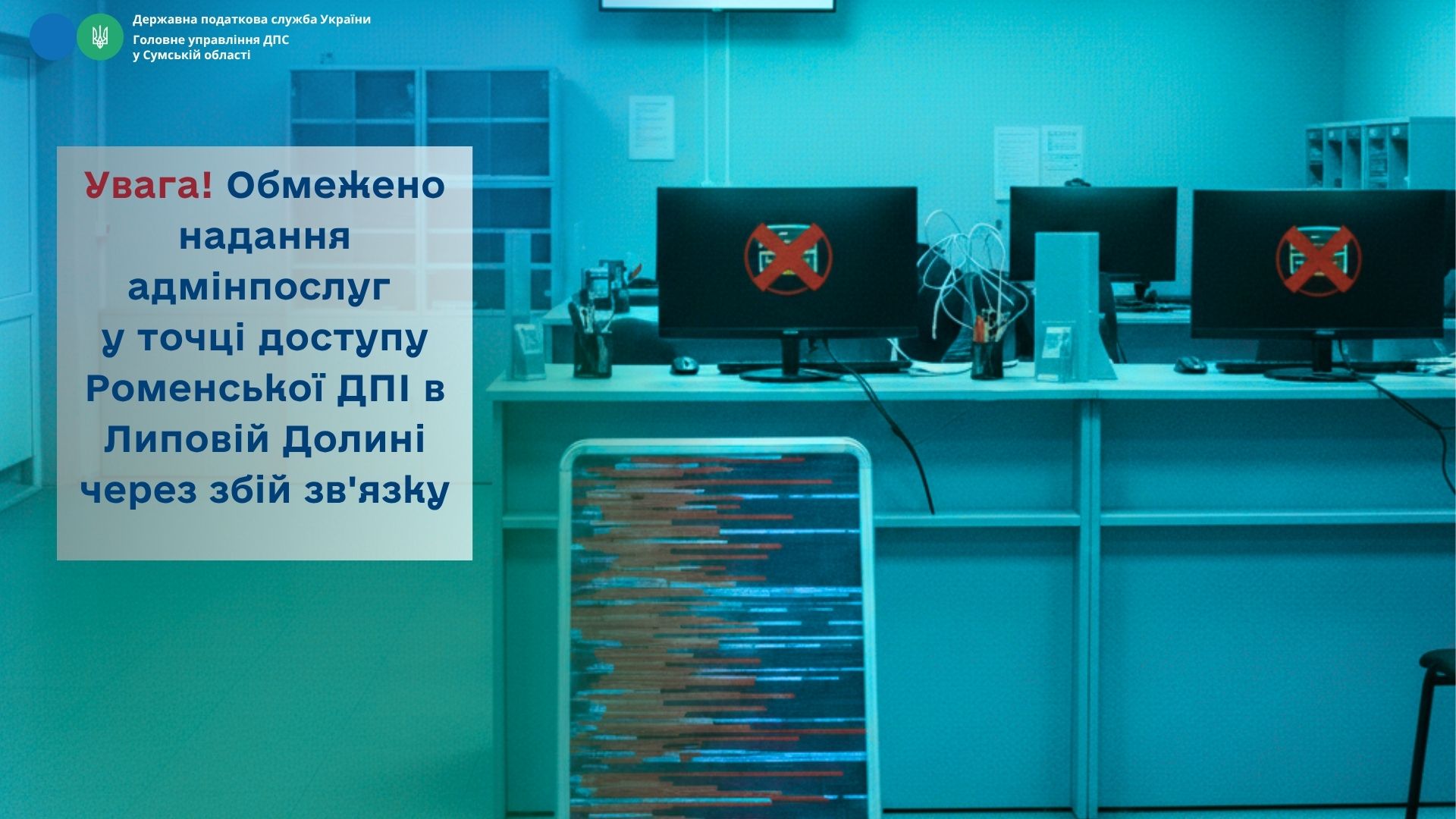 Інформуємо про тимчасові технічні складнощі, які призвели до обмеження у наданні адміністративних та сервісних послуг у пункті обслуговування (точці доступу) за адресою: вул. Сумська, 42, селище Липова Долина, Роменський район, Сумська область, 42500.