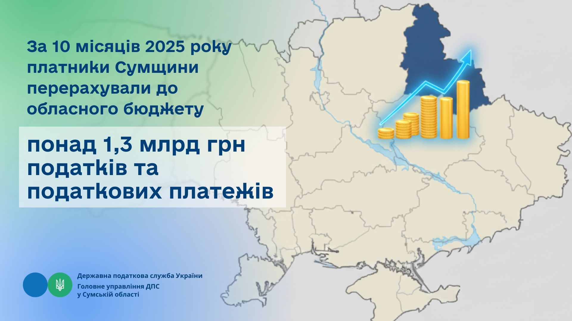 Так, за даними управління економічного аналізу Головного управління ДПС у Сумській області, протягом січня-жовтня 2025 року до обласного бюджету Сумщини надійшло 1 325 763,3 тис. грн податків, зборів та інших податкових платежів, що на 122 410,0 тис. грн (або 10,2%) більше, ніж за відповідний період 2024 року.