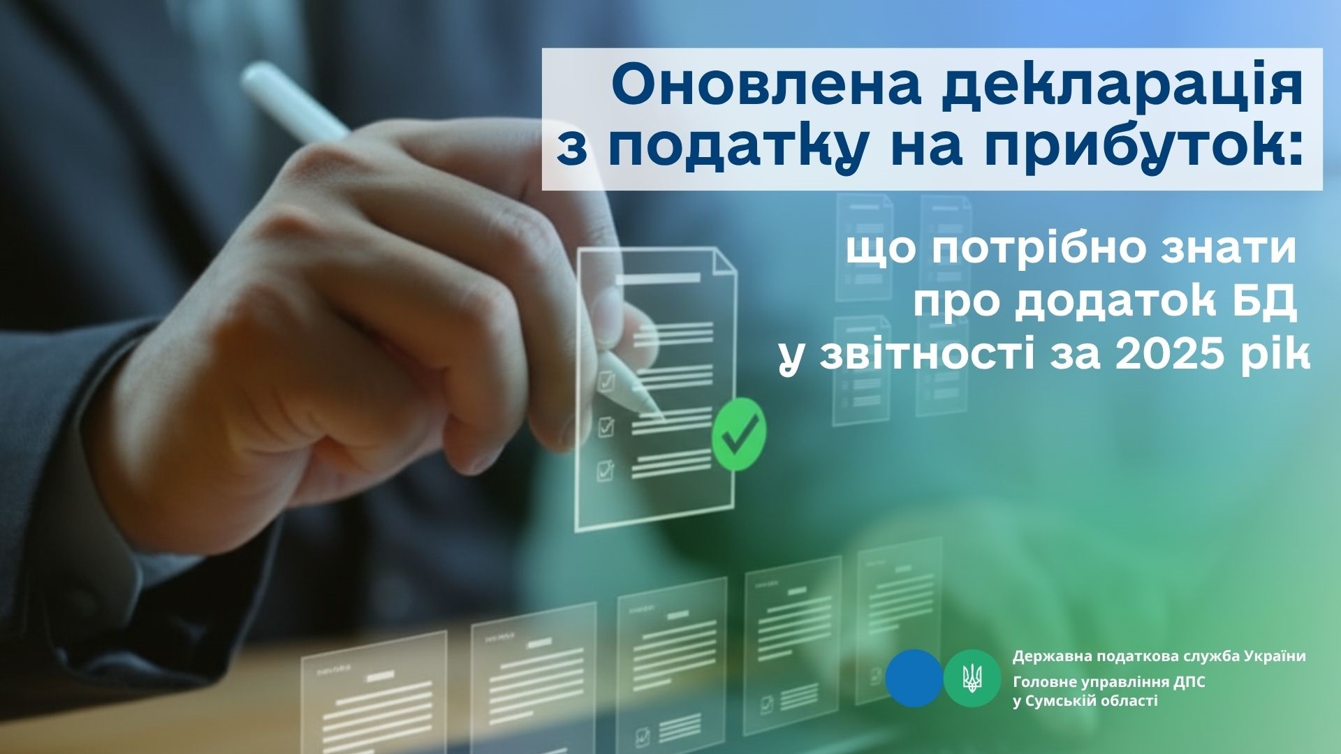 Головне управління ДПС у Сумській області інформує: платники, які надають безоплатну допомогу неприбутковим організаціям, для потреб забезпечення оборони держави та надання гуманітарної допомоги, подаватимуть декларацію з податку на прибуток підприємств за звітний 2025 рік за оновленою формою з додатком БД.