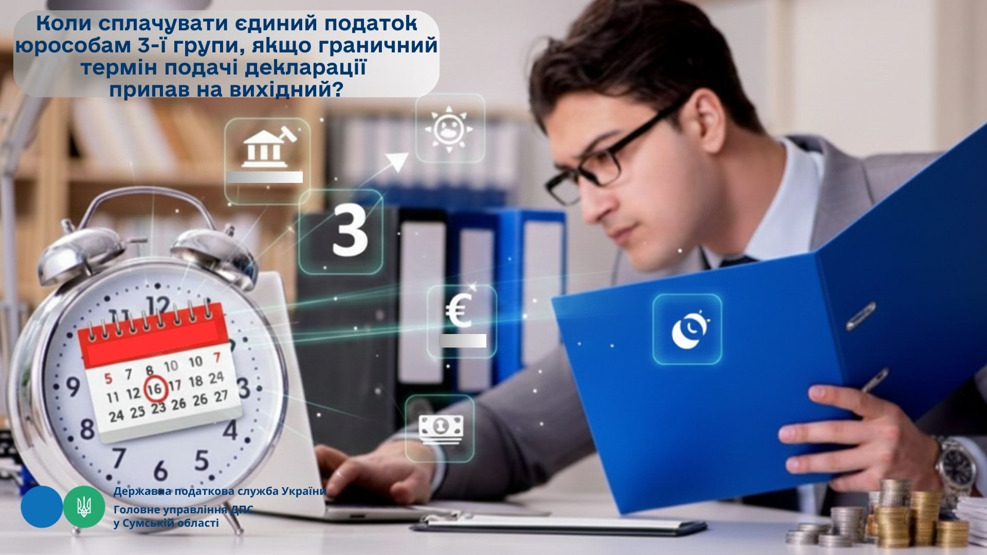 Коли сплачувати єдиний податок юрособам 3-ї групи, якщо граничний термін подачі декларації припав на вихідний?