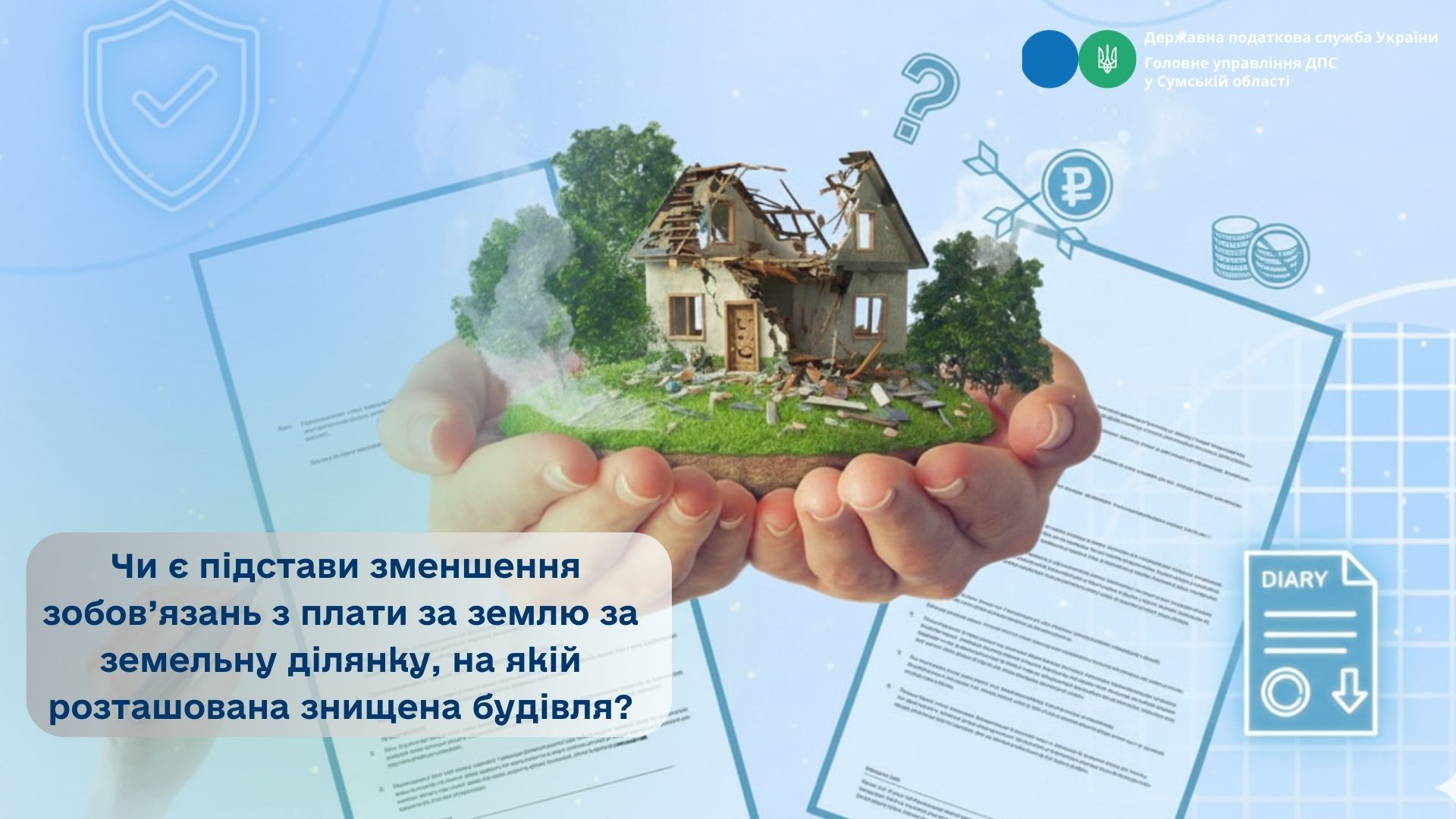 Головне управління ДПС у Сумській області інформує: підпунктом 69.141 пункту 69 підрозділу 10 розділу ХХ Податкового кодексу України передбачено не нарахування та не сплату плати за землю (земельний податок та орендна плата за земельні ділянки державної та комунальної власності), зокрема, за земельні ділянки, на яких розташовані об’єкти житлової та/або нежитлової нерухомості, знищені внаслідок бойових дій, терористичних актів, диверсій, спричинених збройною агресією Російської Федерації проти України, дані про знищення яких та дані про земельні ділянки, на яких були розташовані зазначені об’єкти нерухомого майна, внесені до Державного реєстру майна, пошкодженого та знищеного внаслідок бойових дій, терористичних актів, диверсій, спричинених збройною агресією Російської Федерації проти України, в межах площ (земельних ділянок), визначених цим підпунктом.