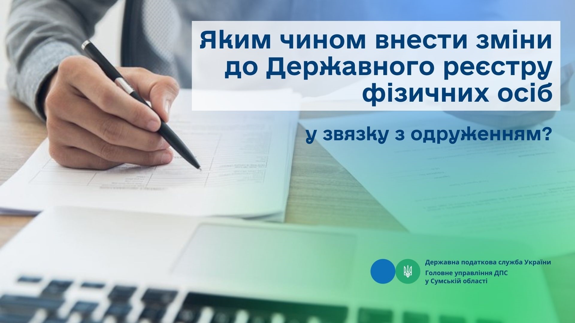Головне управління ДПС у Сумській області  акцентує, що фізичні особи - платники податків зобов'язані подавати до контролюючих органів відомості про зміну даних, які вносяться до Облікової картки або Повідомлення (для фізичних осіб, які через свої релігійні переконання відмовляються від прийняття реєстраційного номера облікової картки платника податків і мають відмітку у паспорті), протягом місяця з дня виникнення таких змін шляхом подання Заяви за формою N 5ДР (додаток 12) або Заяви за формою N 5ДРП (додаток 13) відповідно та документа, що посвідчує особу (після пред'явлення повертається).