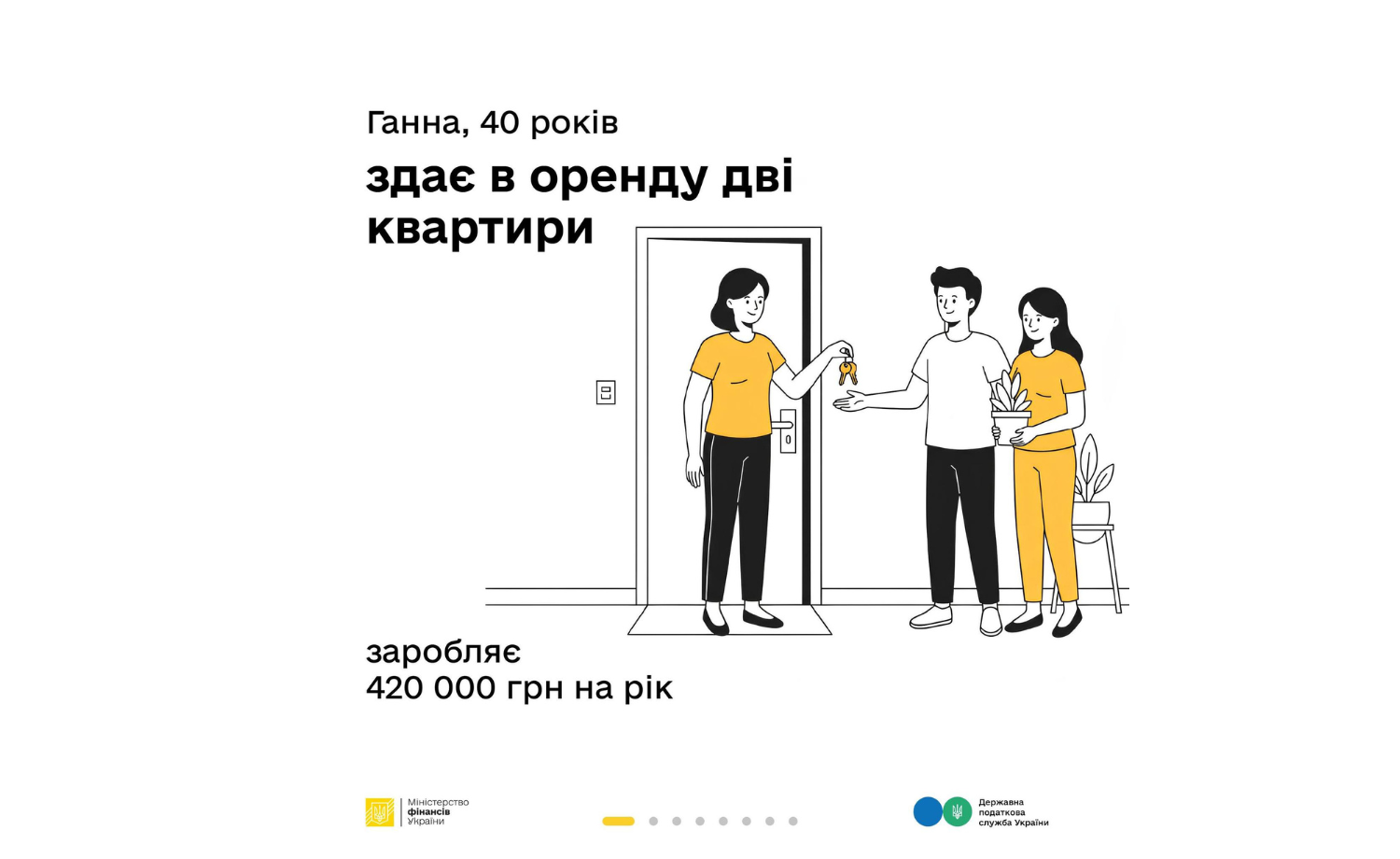 Отже, 40-річна Ганна має кілька однокімнатних квартир, дві з яких здає в оренду. За квартиру в столиці щомісяця вона отримує 20 тис. грн, а за квартиру в Ужгороді – 15 тис. грн (загалом 105 тис. грн/квартал; 420 тис. грн/рік). З метою отримання офіційного доходу Ганна зареєструвала свою діяльність як ФОП (фізична особа – підприємець) 3 групи єдиного податку. Це дозволяє їй офіційно надавати послуги з оренди громадянам України та іноземцям.
