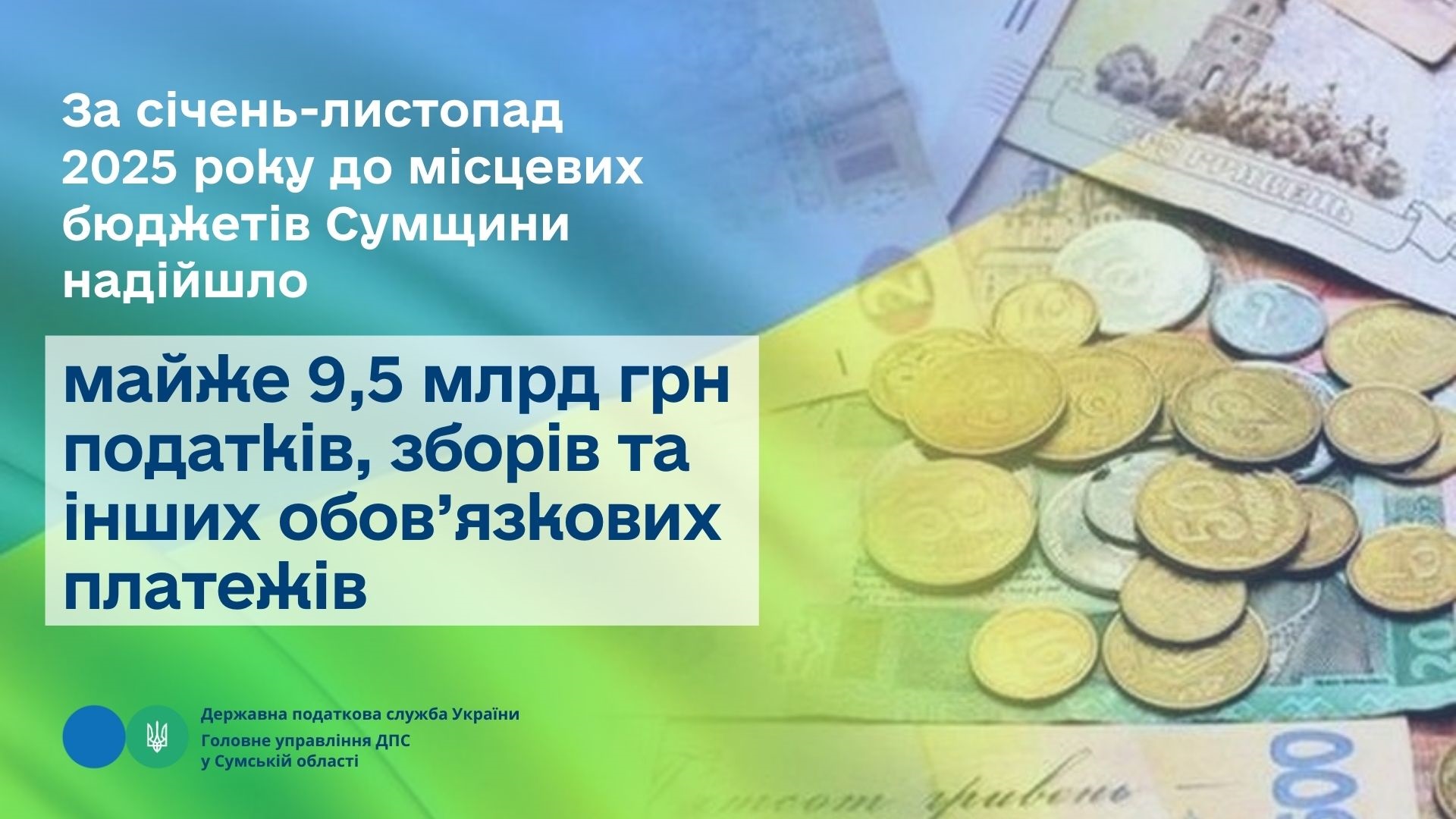 Надходження податків і зборів до місцевих бюджетів Сумщини за 11 місяців 2025 року перевищили минулорічні показники за всіма джерелами. Про це повідомляють в управлінні економічного аналізу Головного управління ДПС у Сумській області.