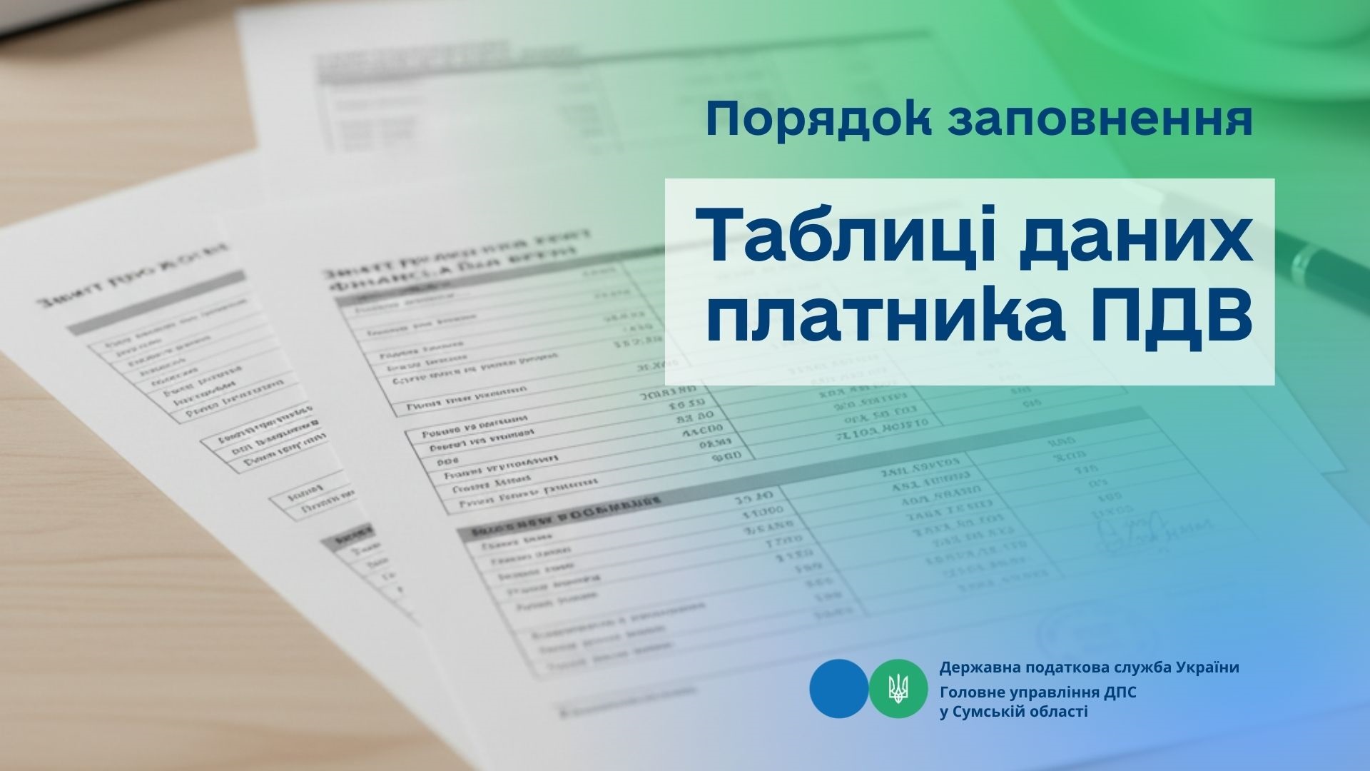 Головне управління ДПС у Сумській області інформує: подання Таблиці даних платника ПДВ передбачено Порядком зупинення реєстрації податкової накладної/розрахунку коригування в Єдиному реєстрі податкових накладних, затвердженим постановою Кабінету Міністрів України від 11 грудня 2019 року № 1165 «Про затвердження порядків з питань зупинення реєстрації податкової накладної/розрахунку коригування в Єдиному реєстрі податкових накладних» (із змінами і доповненнями) (далі Порядок).