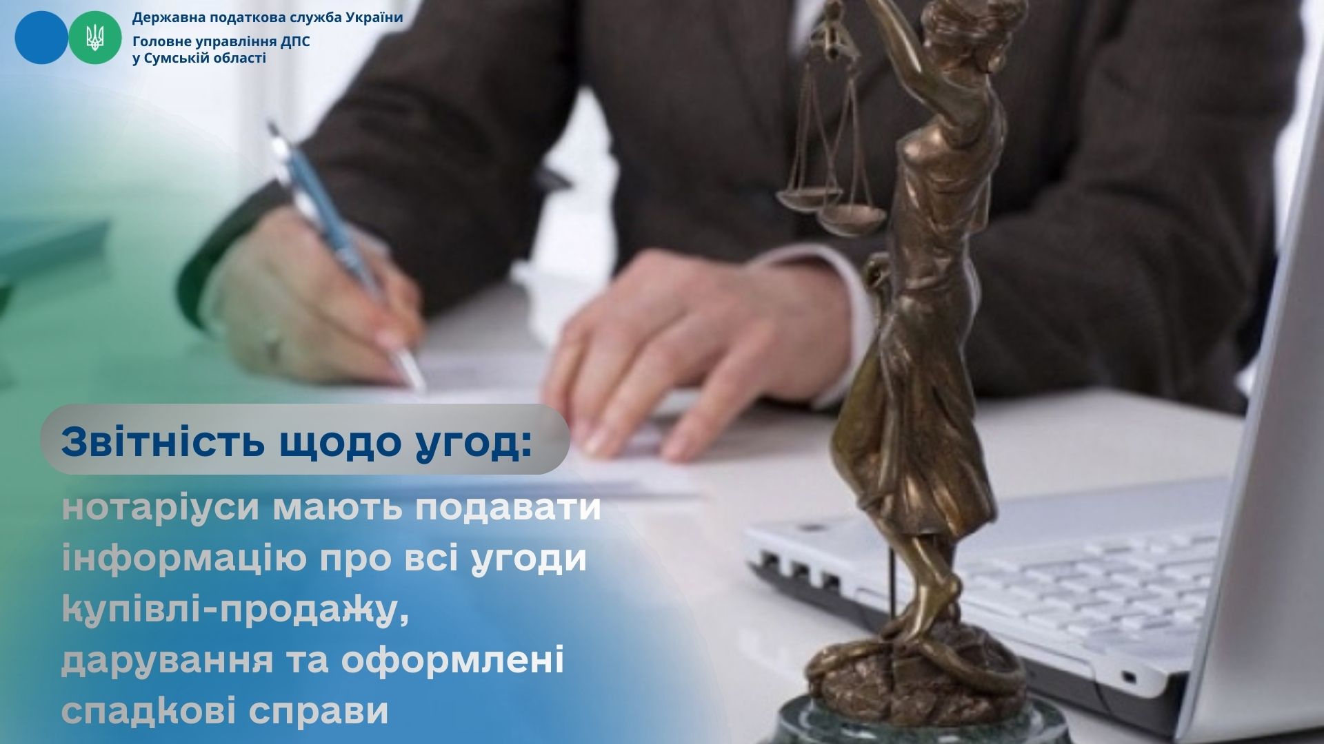 Головне управління ДПС у Сумській області нагадує, що відповідно до п. 172.4 ст. 172, п. 173.4 ст. 173, п. 174.4 ст. 174 розд. IV Податкового кодексу України від 02 грудня 2010 року № 2755-VI із змінами та доповненнями (далі – ПКУ) нотаріус щомісяця в порядку, встановленому розд. ІV ПКУ для податкового розрахунку, подає до контролюючого органу за місцем розташування державної нотаріальної контори або робочого місця приватного нотаріуса інформацію про посвідчені ним протягом звітного місяця договори купівлі-продажу (міни) між фізичними особами та про видачу свідоцтв на право на спадщину.