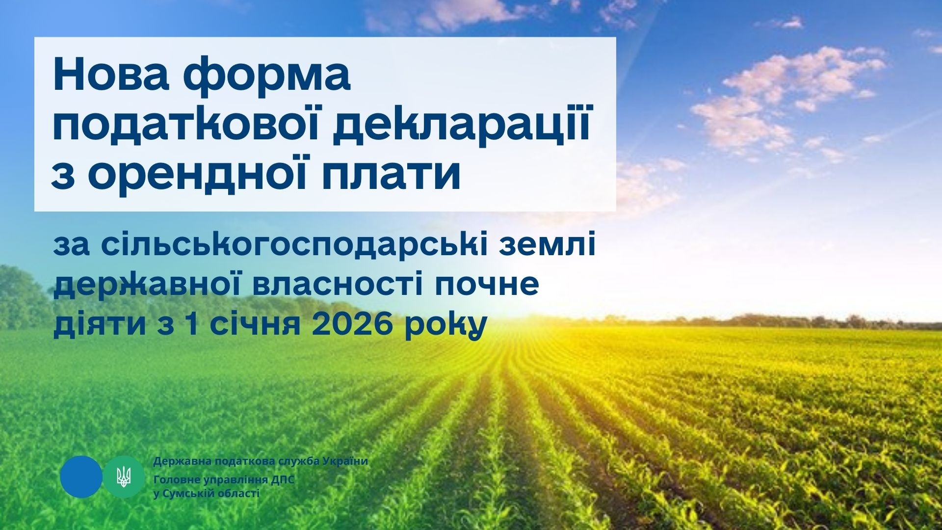 Головне управління ДПС у Сумській області інформує, що з 1 січня 2026 року запроваджується нова форма податкової декларації з орендної плати для земельних ділянок сільськогосподарського призначення державної власності.