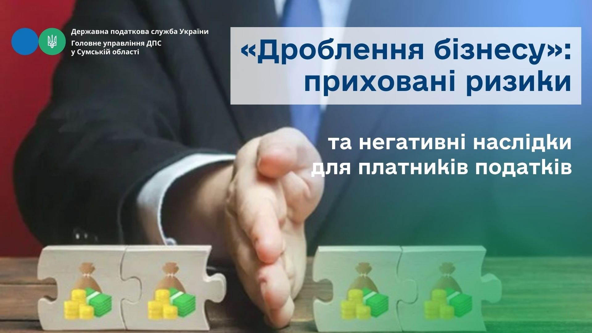 Головне управління ДПС у Сумській області акцентує увагу платників податків на неприпустимості використання такої схеми ухилення від сплати податків, як дроблення бізнесу.  «Дроблення бізнесу» — штучне поділення діяльності на кілька ФОПів-спрощенців — на перший погляд здається способом зменшити податкове навантаження. Однак така схема несе значні юридичні, фінансові та репутаційні ризики.