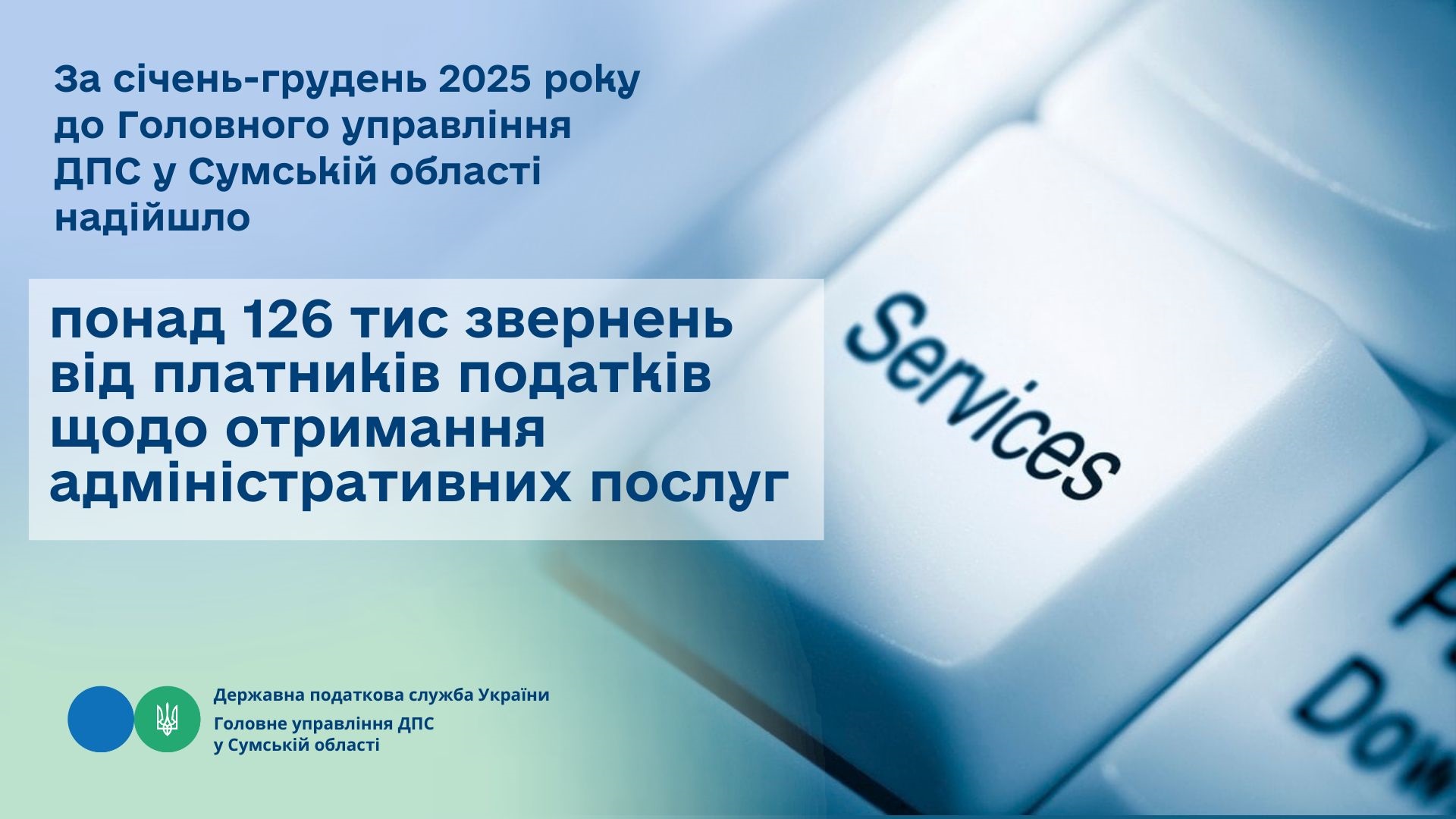 За січень-грудень 2025 року до Головного управління ДПС у Сумській області надійшло понад 126 тис звернень від платників податків щодо отримання адміністративних послуг