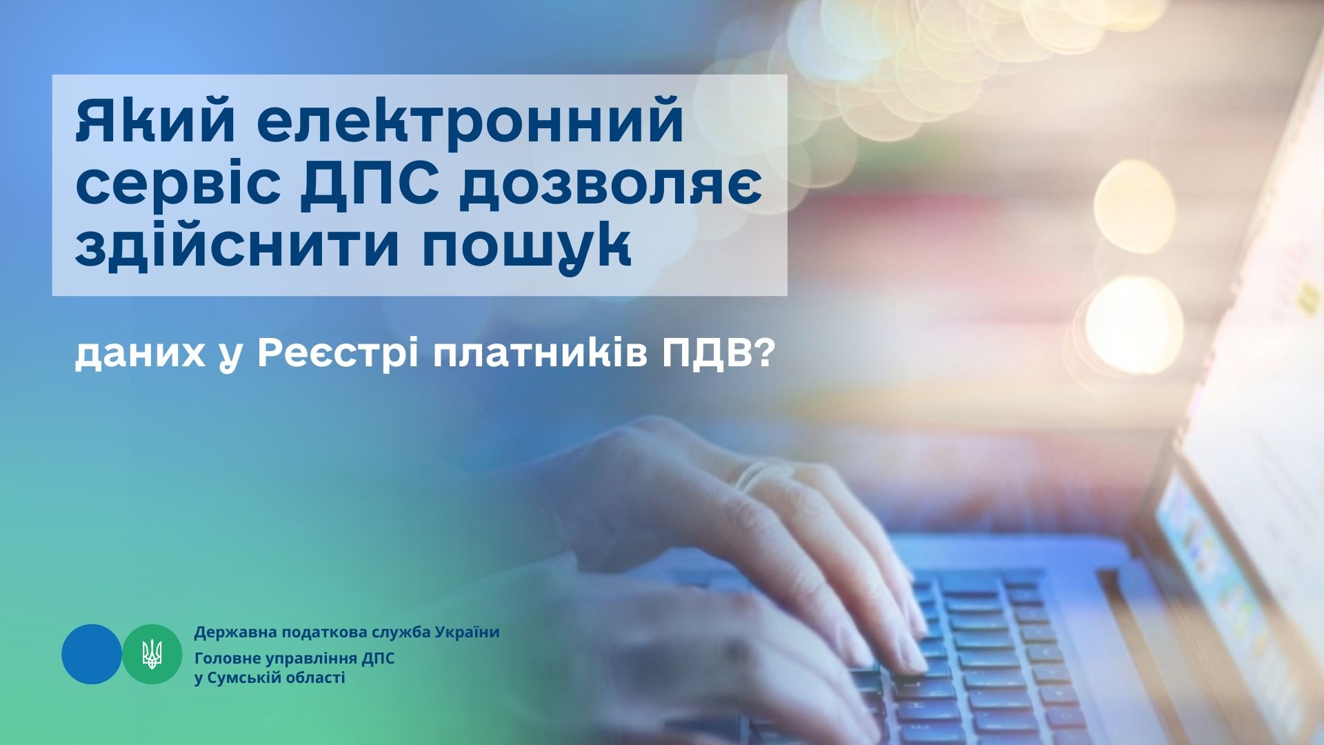 Головне управління ДПС у Сумській області інформує, що у відкритій та приватній частинах Електронного кабінету, розміщеного на офіційному вебпорталі ДПС, платники податків мають доступ, зокрема до сервісу «Дані реєстру платників ПДВ».