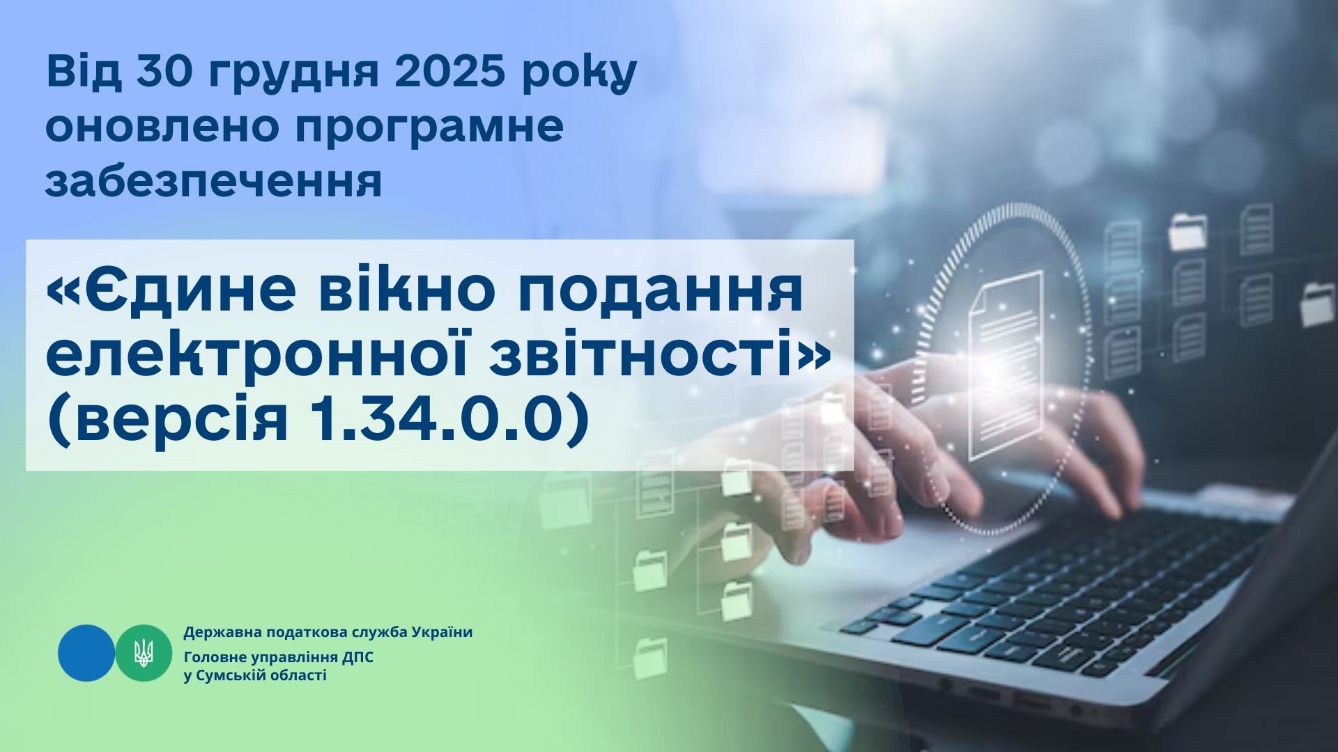 Головне управління ДПС у Сумській області інформує, що 30.12.2025 було оновлено спеціалізоване клієнтське програмне забезпечення для формування та подання звітності до «Єдиного вікна подання електронної звітності».