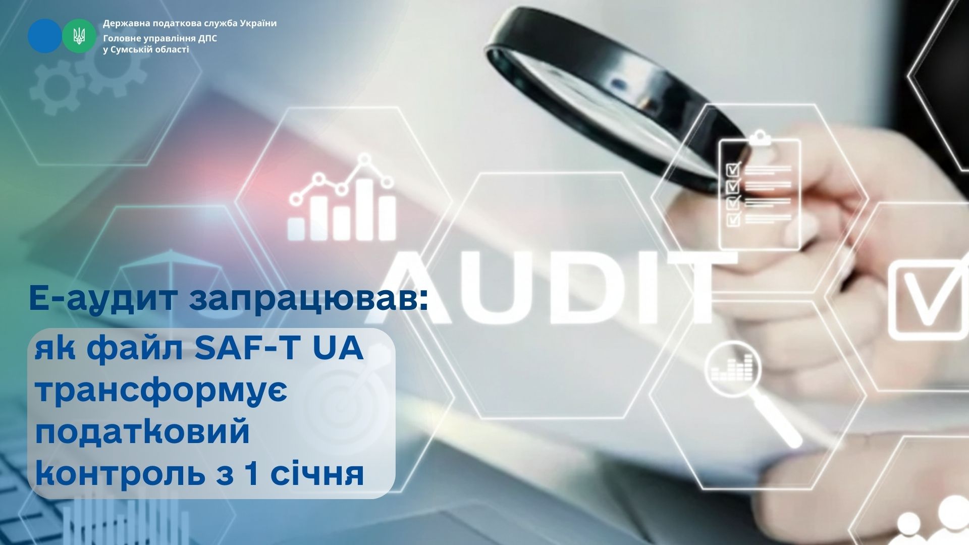 Головне управління ДПС у Сумській області повідомляє, що з 1 січня поточного року запрацювала система електронного аудиту – Е-аудит. Це сучасний цифровий інструмент податкового контролю. Він сприятиме ще більшій прозорості у відносинах між бізнесом та податковою.