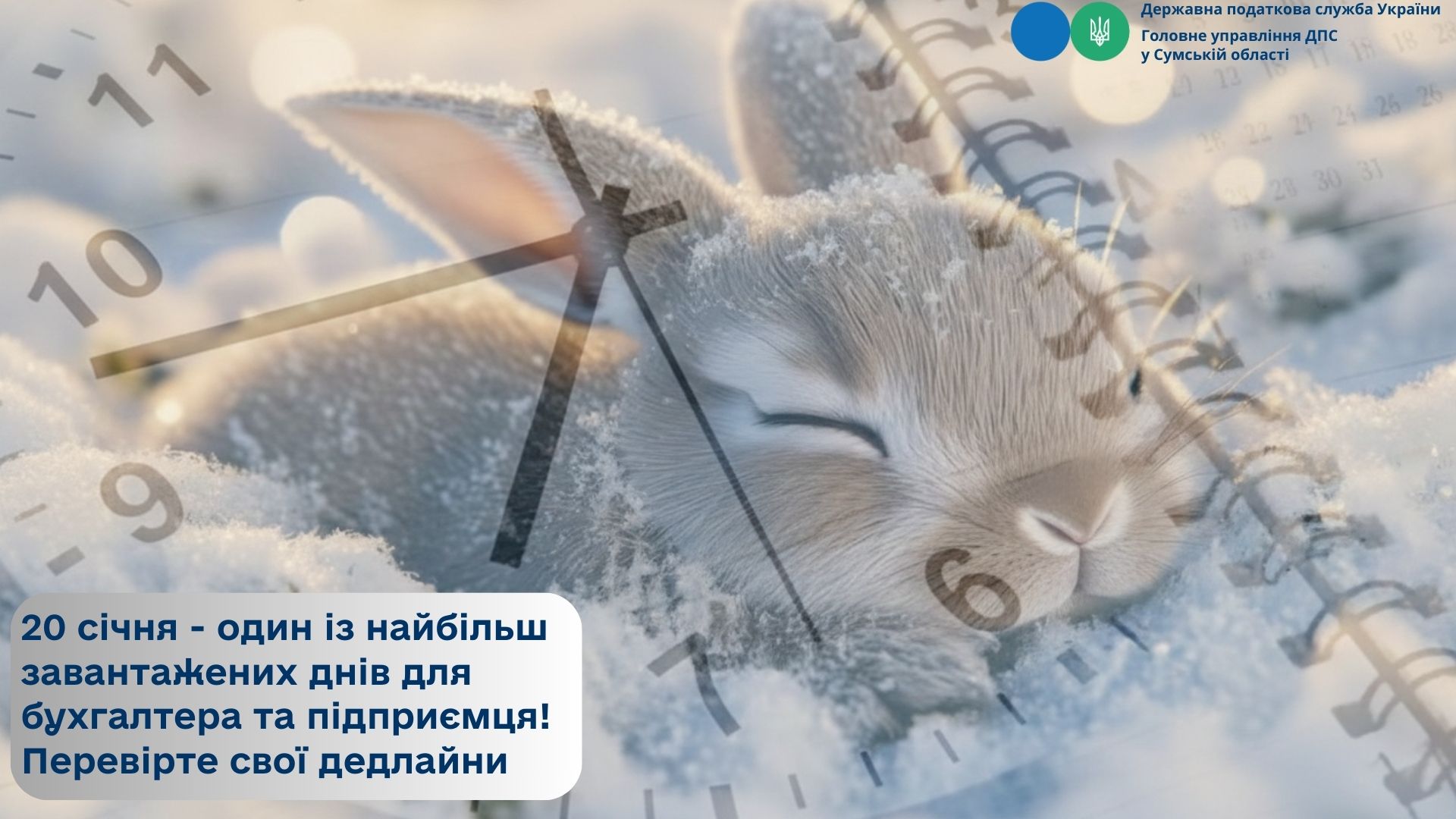 Головне управління ДПС у Сумській області акцентує, що на 20 січня 2026 року (вівторок) встановлено багато граничних термінів для звітування та сплати податків. Це один із найбільш завантажених днів у податковому календарі України.