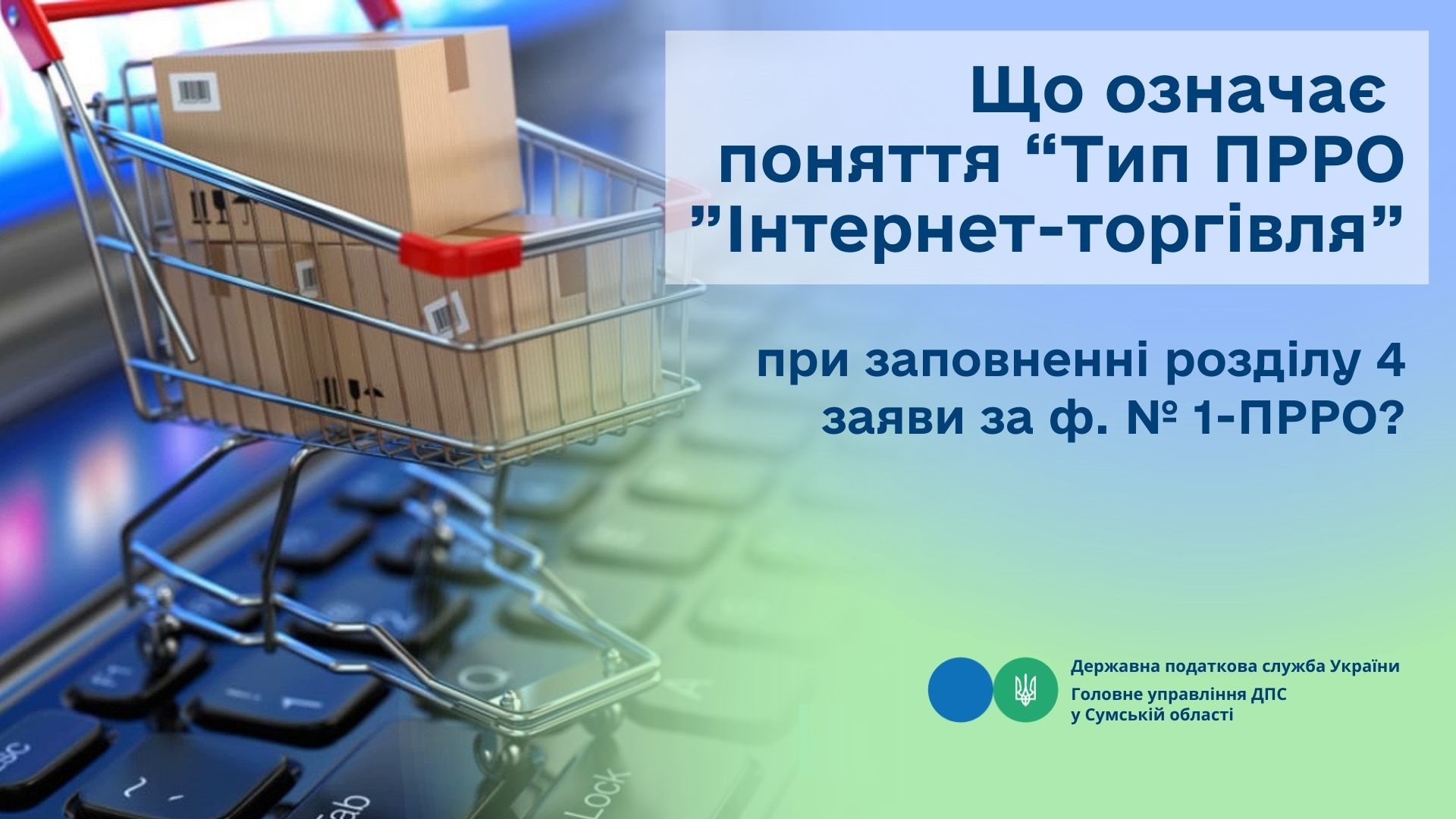 З метою заповнення розділу 4 «Дані щодо ПРРО» заяви про реєстрацію програмних реєстраторів розрахункових операцій за ф. № 1-ПРРО (далі – Заява за ф. № 1-ПРРО), форма якої затверджена наказом Міністерства фінансів України від 23.06.2020№ 317 «Про внесення змін до наказу Міністерства фінансів України від 14 червня 2016 року № 547», поняття тип програмного реєстратора розрахункових операцій (далі – ПРРО) «Інтернет торгівля» означає, що такий ПРРО встановлений на конкретну господарську одиницю і використовується за адресою, зазначеною в реєстраційній Заяві за ф. № 1-ПРРО, та при його застосуванні можливе залучення касира (інтернет-магазин (сайт)).