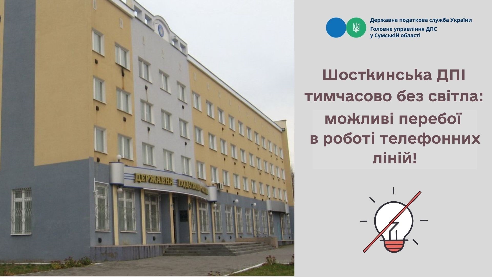 Головне управління ДПС у Сумській області повідомляє, що у зв’язку з відсутністю електропостачання сьогодні, 20.01.2026, можливі тимчасові перебої в роботі телефонних ліній Шосткинської ДПІ.