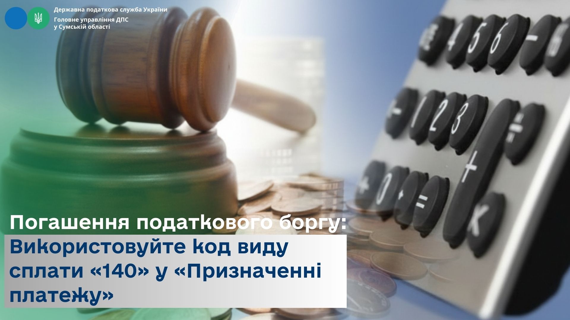 Погашення податкового боргу: Використовуйте код виду сплати «140» у «Призначенні платежу»