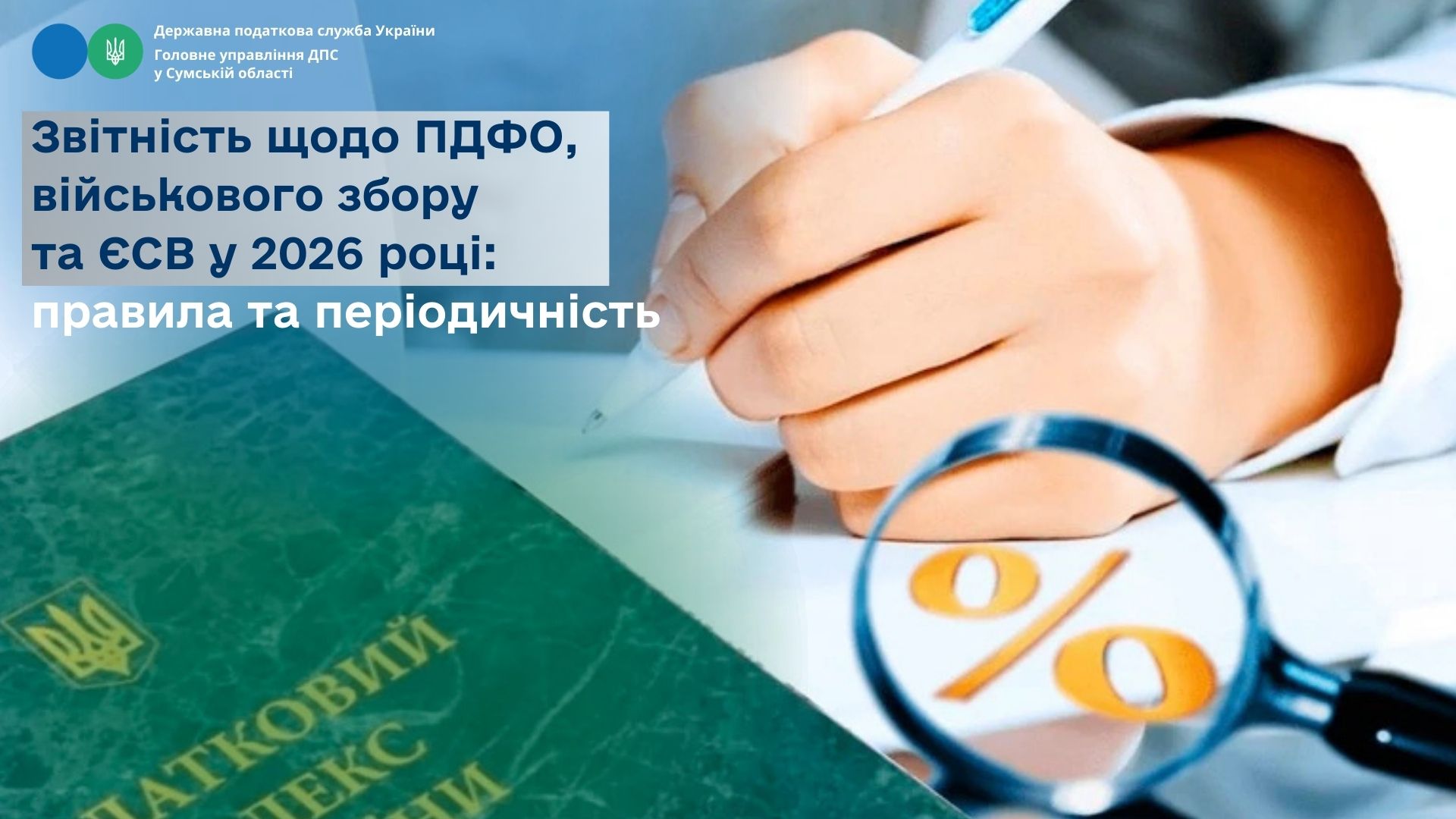 Головне управління ДПС у Сумській області інформує, що з 01.01.2026 відповідно до п.п. «б» п. 176.2 ст. 176 Податкового кодексу України від 02 грудня 2010 року № 2755-VІ із змінами та доповненнями (далі – ПКУ) особи, які відповідно до цього Кодексу мають статус податкових агентів, та платники єдиного внеску зобов'язані подавати податковий розрахунок сум доходу, нарахованого (сплаченого) на користь платників податків - фізичних осіб, і сум утриманого з них податку, а також сум нарахованого єдиного внеску до контролюючого органу за основним місцем обліку: