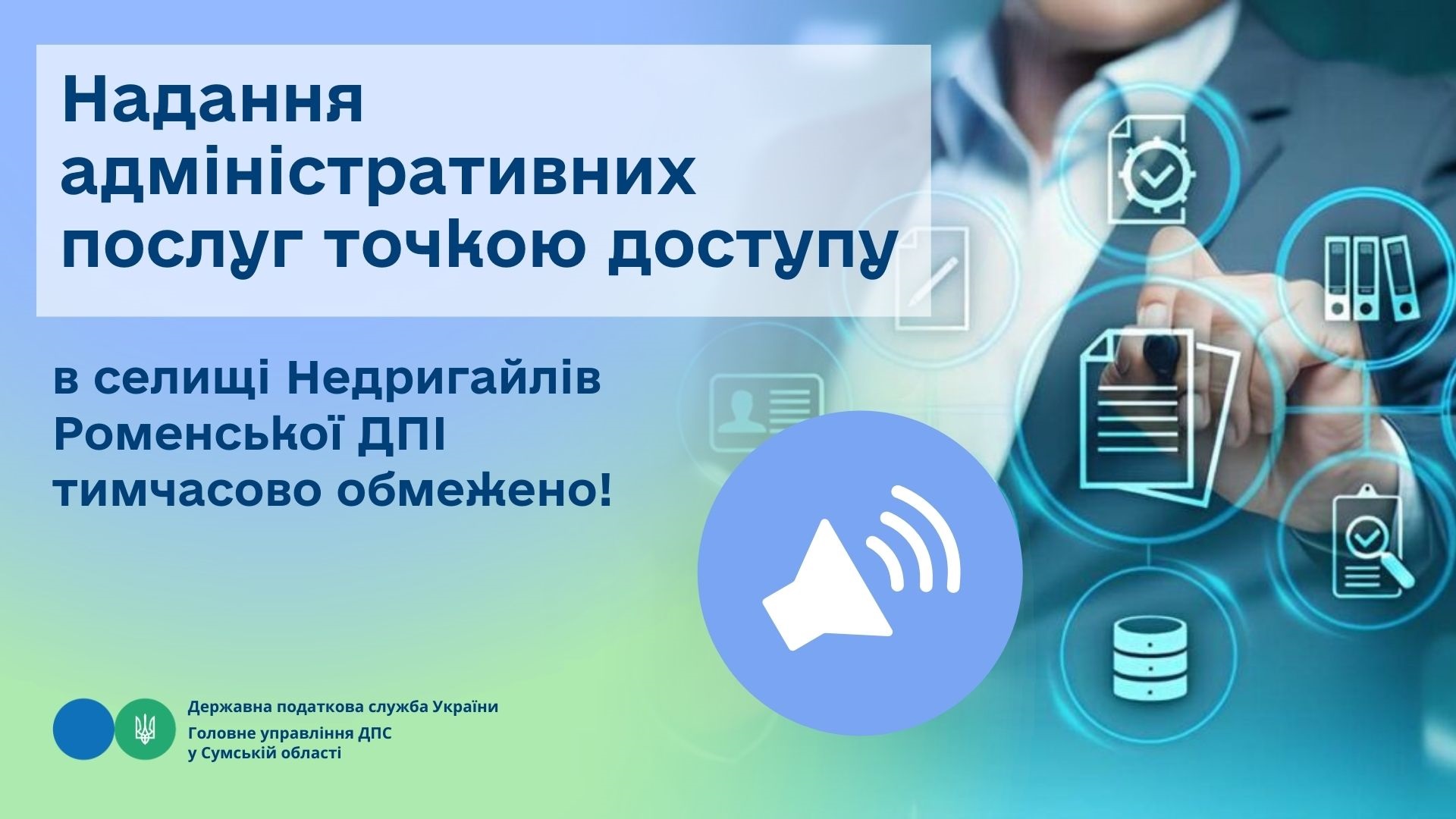 З технічних причин протягом дня 10.02.2026 на точці доступу за адресою : вул. Вишнева,2, селище Недригайлів, Роменський район, Сумська область, тимчасово обмежено надання адміністративних послуг, а саме:
