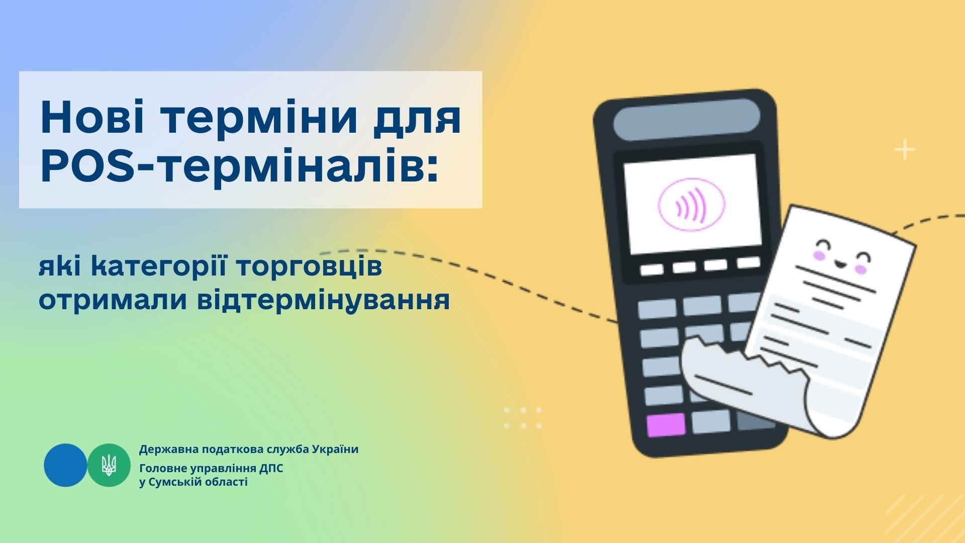 Головне управління ДПС у Сумській області інформує, що відтерміновано строки обов’язкового забезпечення безготівкових розрахунків, у тому числі через електронні платіжні засоби, застосунки та платіжні пристрої, для окремих торговців.
