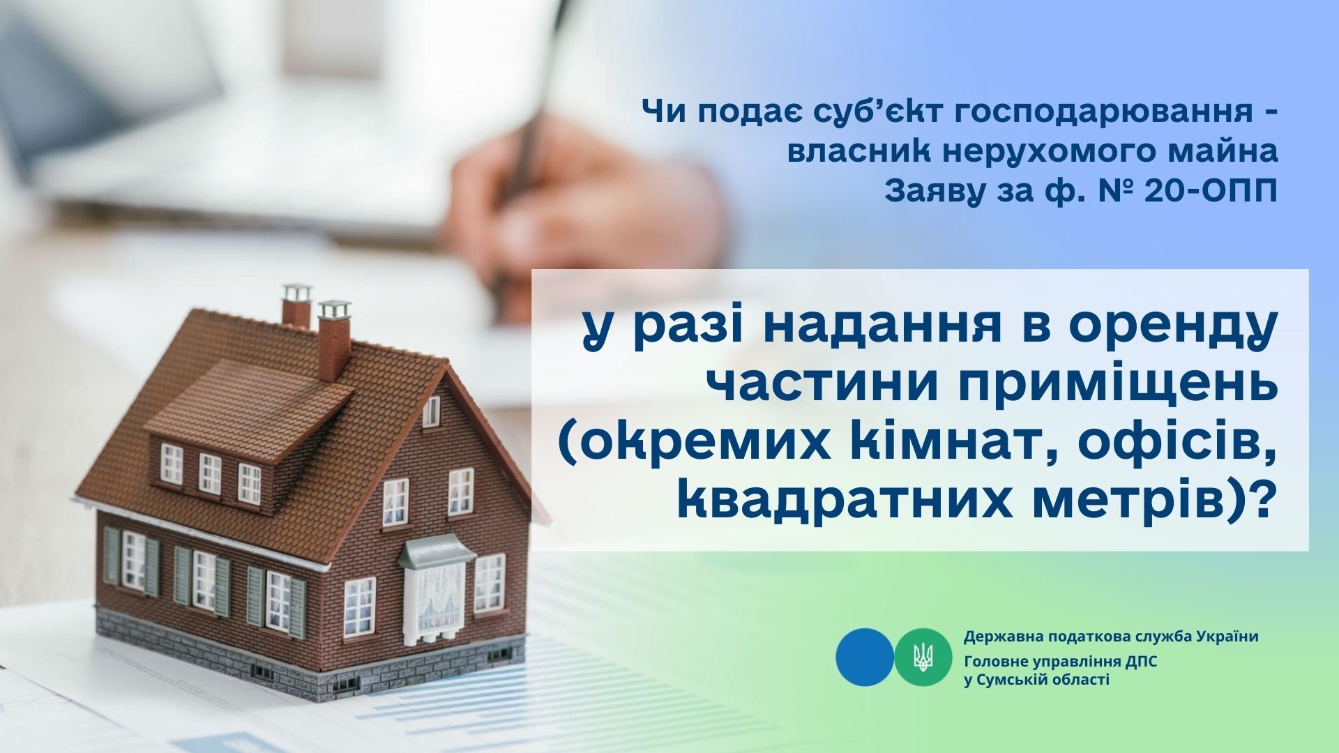 Отже суб’єкт господарювання – власник нерухомого майна у разі надання в оренду частини приміщень (окремих кімнат, офісів, квадратних метрів) повинен подати Заяву за ф. № 20-ОПП у порядку та терміни, визначені пп. 8.3-8.5 розд. VIII Порядку № 1588. Пунктом 8.4 розд. VIII Порядку № 1588 визначено, що під час надання Заяви за ф. № 20-ОПП застосовується принцип укрупнення інформації, яка надається про об’єкт оподаткування (наприклад, якщо подається інформація про об’єкти оподаткування – офіс, склад, склад-магазин, розташовані в одному офісному центрі за одною адресою, достатньо надати інформацію за одним із типів об’єктів оподаткування, зазначивши у найменуванні: офіс, склад, склад-магазин). Якщо в оренду надаються однотипні об’єкти оподаткування за різним місцезнаходженням, інформація у Заяві за ф. № 20-ОПП відображається по кожному об’єкту окремо.