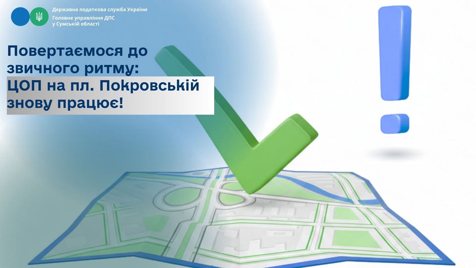 Інформуємо платників податків, що Центр обслуговування платників Сумської ДПІ Головного управління ДПС у Сумській області відновлює надання адміністративних послуг за адресою: м. Суми, пл. Покровська, 2.