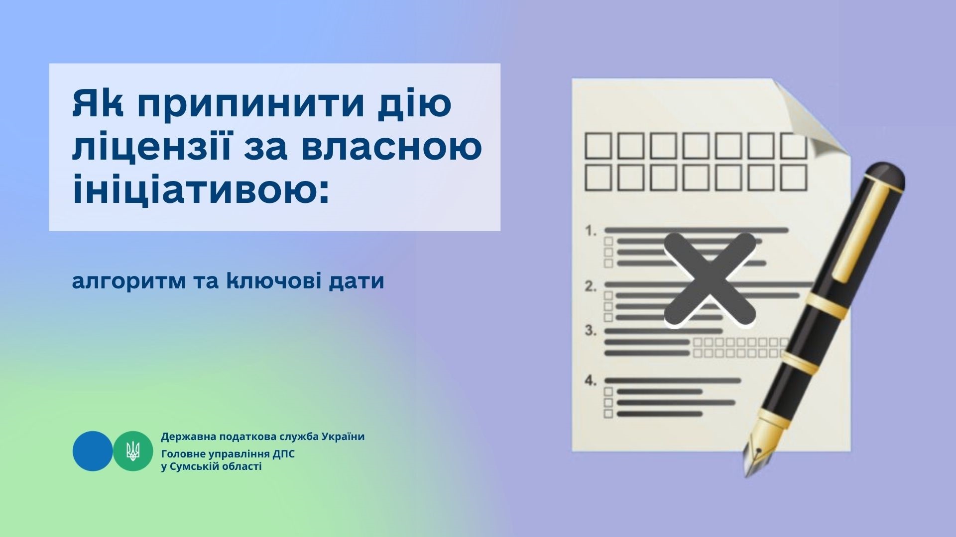 Відповідно до частини першої ст. 46 Закону України від 18 червня 2024 року № 3817-ІХ «Про державне регулювання виробництва і обігу спирту етилового, спиртових дистилятів, біоетанолу, алкогольних напоїв, тютюнових виробів, тютюнової сировини, рідин, що використовуються в електронних сигаретах, та пального» (далі – Закон № 3817) дія ліцензії припиняється шляхом прийняття органом ліцензування, який надав відповідну ліцензію, рішення про припинення дії ліцензії на право провадження відповідного виду господарської діяльності.