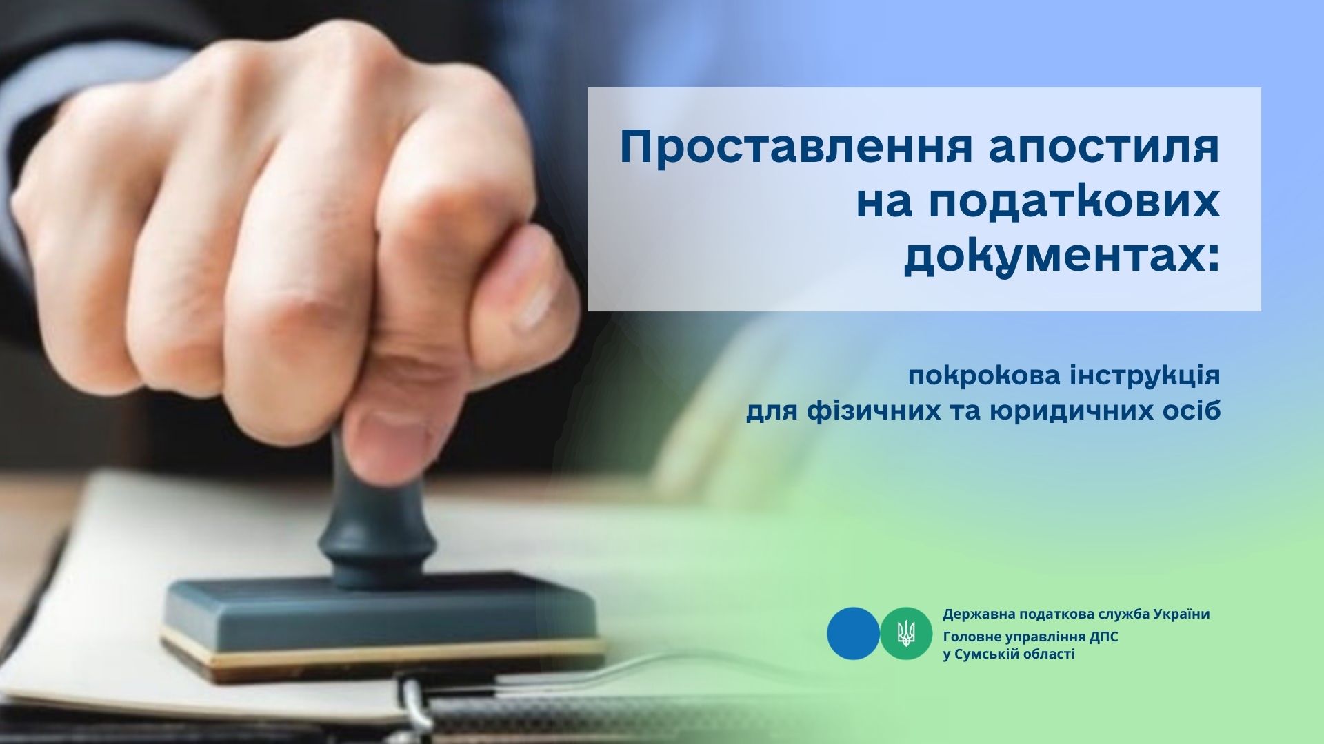 Головне управління ДПС у Сумській області повідомляє, що для засвідчення автентичності документа, виданого ДПС та/або її територіальними органами, підтвердження дійсності проставлених підписів та печаток ДПС проставляється спеціальний штамп – апостиль.