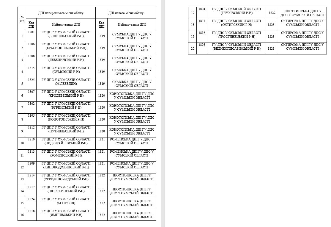 Враховуючи вимоги Постанови та наказу ДПС від 07.10.2024 № 747 «Про затвердження переліку державних податкових інспекцій», яким затверджено перелік державних податкових інспекцій Головного управління ДПС у Сумській області (далі – ДПІ) платники податків Сумської області обліковуються у таких ДПІ