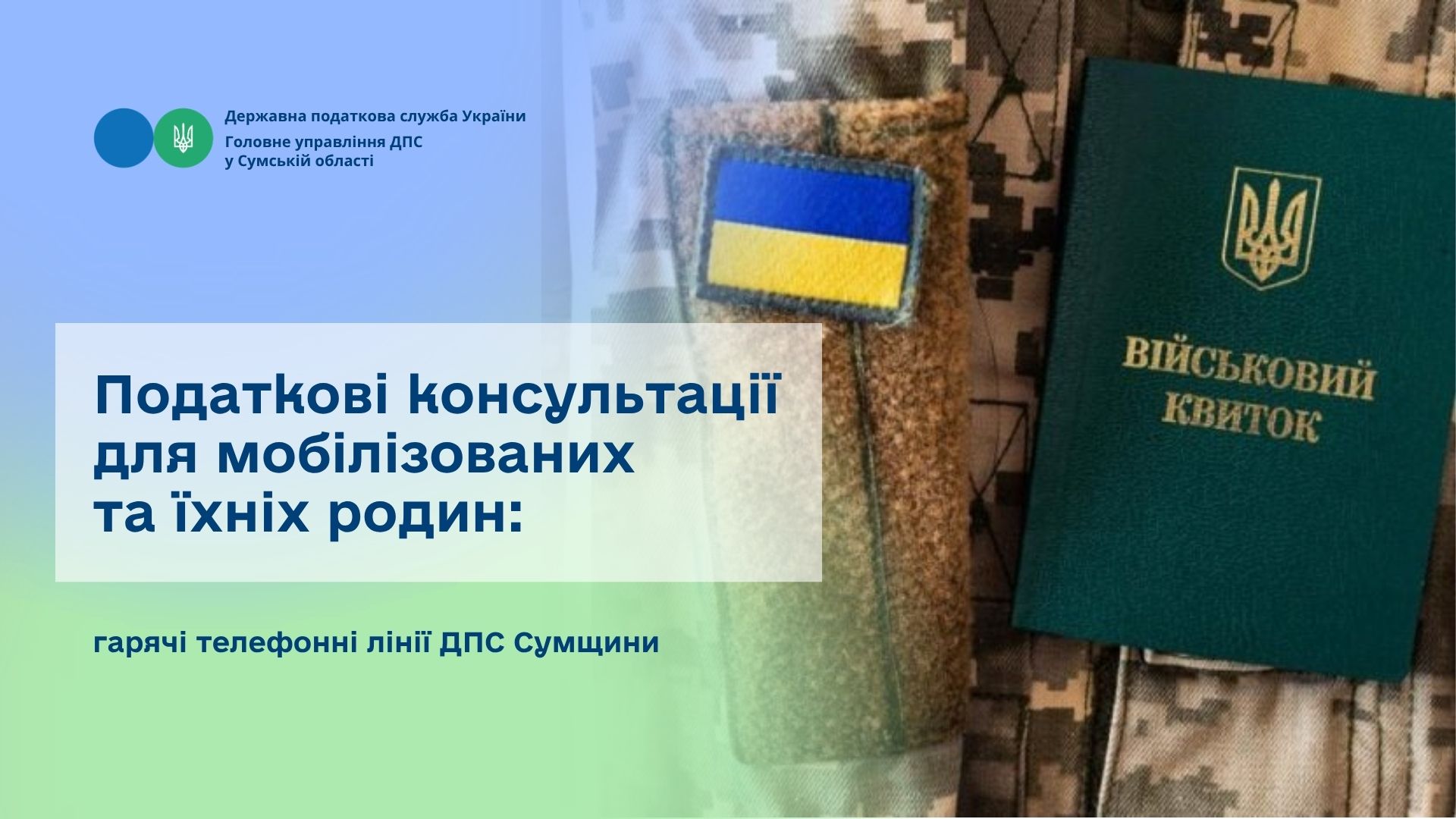 Головне управління ДПС у Сумській області нагадує: для надання роз’яснень і консультацій мобілізованим та демобілізованим громадянам, а також членам їхніх родин, з актуальних податкових питань при податковій службі Сумщини діють гарячі телефонні лінії.