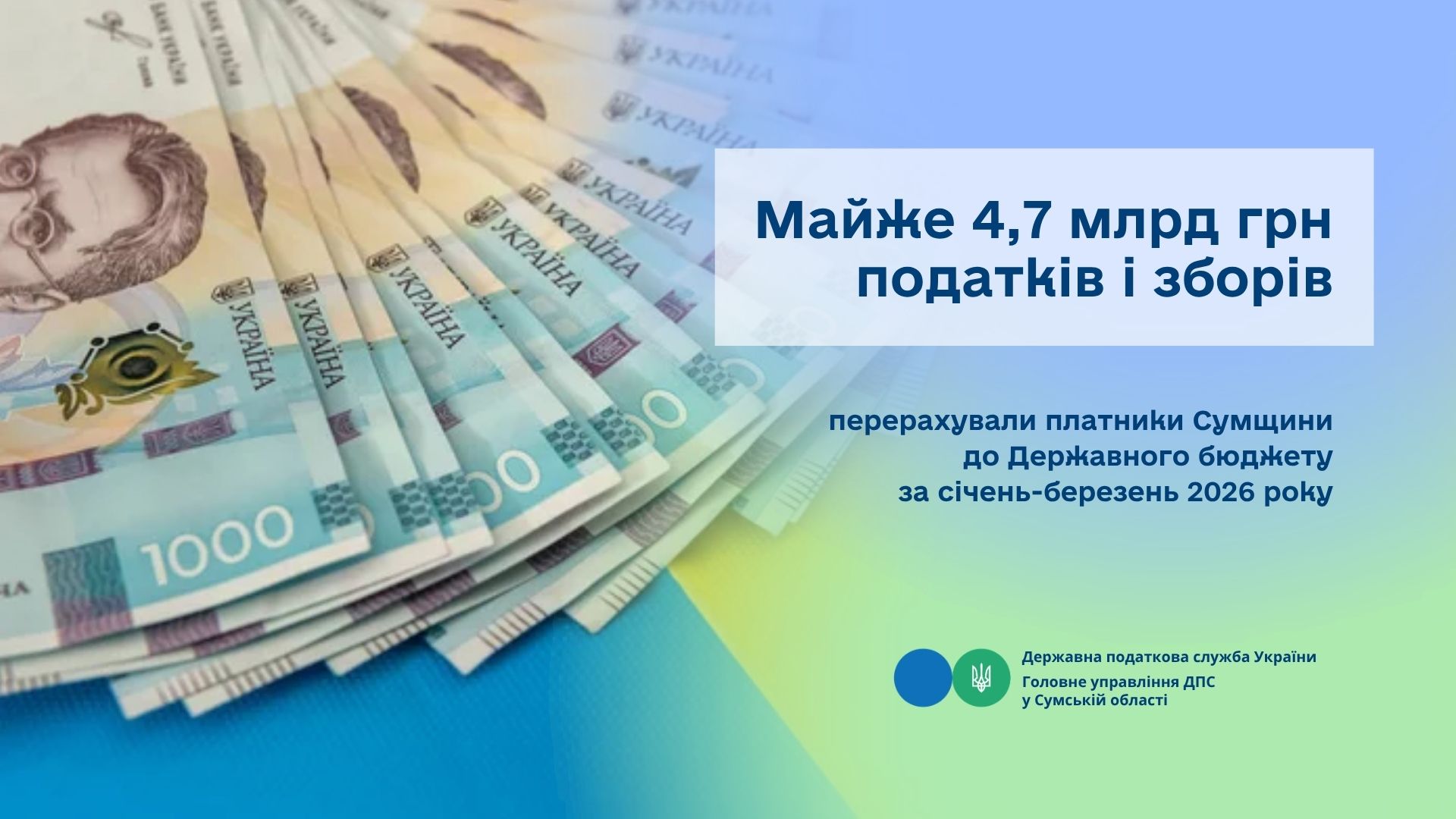 За даними управління економічного аналізу Головного управління ДПС у Сумській області, за 3 місяці 2026 року до зведеного бюджету України від платників Сумської області надійшло 7 378,9 млн грн, що на 299,7 млн грн або на 4,2 відс. більше минулорічного показника.