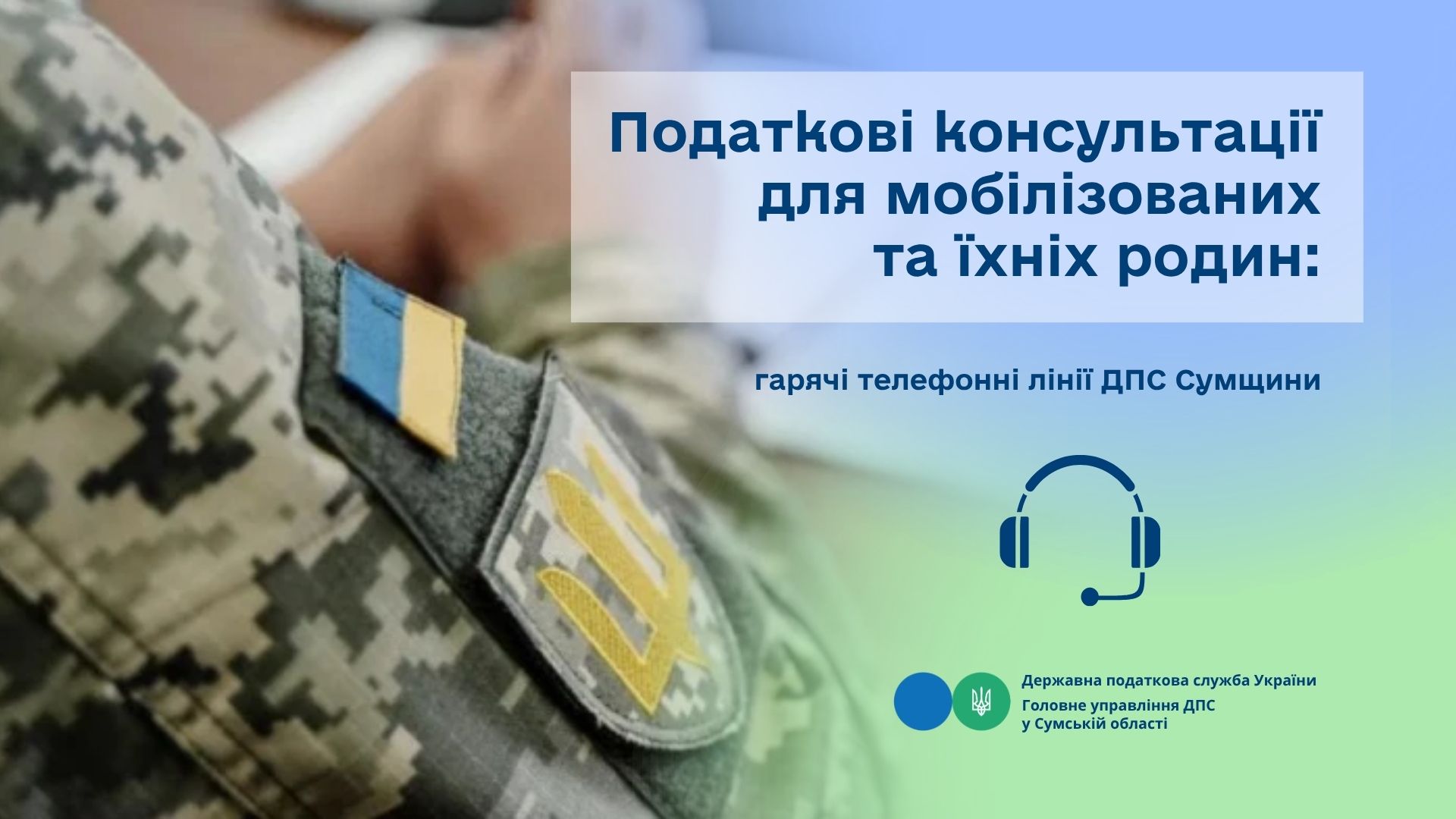 Головне управління ДПС у Сумській області нагадує: для надання роз’яснень і консультацій мобілізованим та демобілізованим громадянам, а також членам їхніх родин, з актуальних податкових питань при податковій службі Сумщини діють гарячі телефонні лінії.
