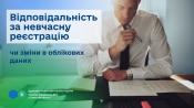 Згідно з п. 117.1 ст. 117 Податкового кодексу України від 02 грудня 2010 року № 2755-VI із змінами та доповненнями (далі – ПКУ) неподання у строки та у випадках, передбачених ПКУ, заяв або документів для взяття на облік у відповідному контролюючому органі, реєстрації змін місцезнаходження чи внесення інших змін до своїх облікових даних, неподання виправлених документів для взяття на облік чи внесення змін, подання з помилками чи у неповному обсязі, неподання відомостей стосовно осіб, відповідальних за ведення бухгалтерського обліку та/або складення податкової звітності, відповідно до вимог встановлених ПКУ, – тягнуть за собою накладення штрафу на самозайнятих осіб у розмірі 340 грн., на юридичних осіб, відокремлені підрозділи юридичної особи чи юридичну особу, відповідальну за нарахування та сплату податків до бюджету під час виконання договору про спільну діяльність, – 1020 гривень.