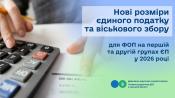 Головне управління ДПС у Сумській області нагадує, що з 1 січня 2026 року для фізичних осіб – підприємців, які працюють на першій та другій групах єдиного податку, діятимуть нові розміри ставок єдиного податку та військового збору.