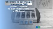Відповідно до п. 181.1 ст. 181 Податкового кодексу України від 02 грудня 2010 року № 2755-VI із змінами та доповненнями (далі – ПКУ) у разі якщо загальна сума від здійснення операцій з постачання товарів/послуг, що підлягають оподаткуванню згідно з розд. V ПКУ, у тому числі операцій з постачання товарів/послуг з використанням локальної або глобальної комп’ютерної мережі (зокрема, але не виключно шляхом встановлення спеціального застосунку або додатку на смартфонах, планшетах чи інших цифрових пристроях), нарахована (сплачена) такій особі протягом останніх 12 календарних місяців, сукупно перевищує 1000000 грн. (без урахування ПДВ), така особа зобов’язана зареєструватися як платник податку у контролюючому органі за своїм місцезнаходженням (місцем проживання) з дотриманням вимог, передбачених ст. 183 ПКУ, крім особи, яка є платником єдиного податку першої - третьої групи.