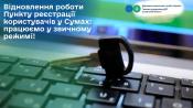 Пункт реєстрації користувачів Головного управління ДПС у Сумській області повертається до стандартного режиму роботи. Усі сервіси знову будуть доступні у повному обсязі сьогодні з 13:00 за адресою пл. Покровська, 2