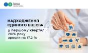 У першому кварталі 2026 року надходження єдиного внеску на загальнообов’язкове державне соціальне страхування становили 173,4 млрд грн. Це на 17,2 % або на 25,4 млрд грн більше показника аналогічного періоду минулого року. Тоді надійшло 148 млрд грн єдиного внеску.